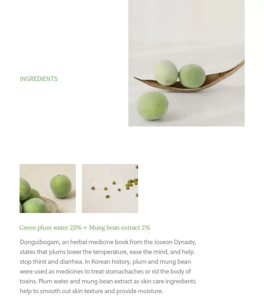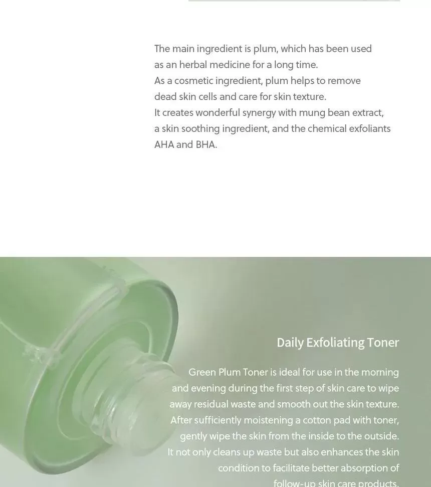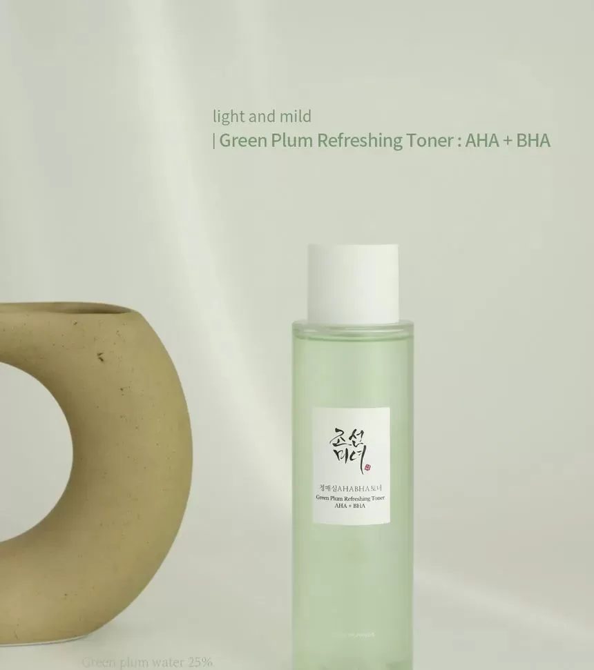 Beauty of Joseon Green Plum Refreshing Toner AHA + BHA er en forfriskende toner som inneholder Hangbang (tradisjonell Koreansk urtemedisin), 25% grønn plomme vann som fukter huden. Toneren inneholder 3% AHA som eksfolierer døde hudceller og fjerner talg fra huden og porene.