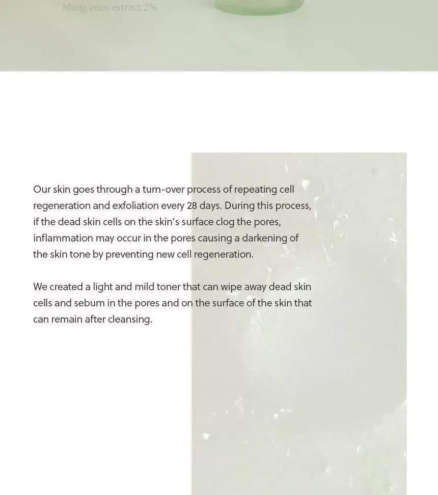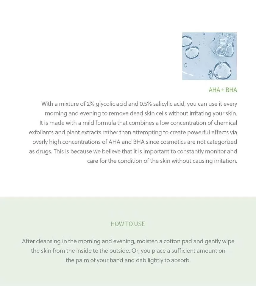| Ingredienser | Water, Prunus Mume Fruit Water, Dipropylene Glycol Dibenzoate, 1,2-Hexanediol, Tromethamine, Glycolic Acid, Phaseolus Radiatus Seed Extract, Panax Ginseng Root Extract, Oryza Sativa (Rice) Bran Water, Portulaca Oleracea Extract, Butylene Glycol, Glycerin, Salicylic Acid, Melia Azadirachta Leaf Extract, Melia Azadirachta Flower Extract, Fructose, Tocopherol, Glucose, Sodium PCA, Triethylhexanoin, Diphenyl Dimethicone, C12-14 Pareth-12, Ethylhexylglycerin, Hydrogenated Lecithin, Polyglyceryl-10 Oleate, Tetrasodium EDTA. |
