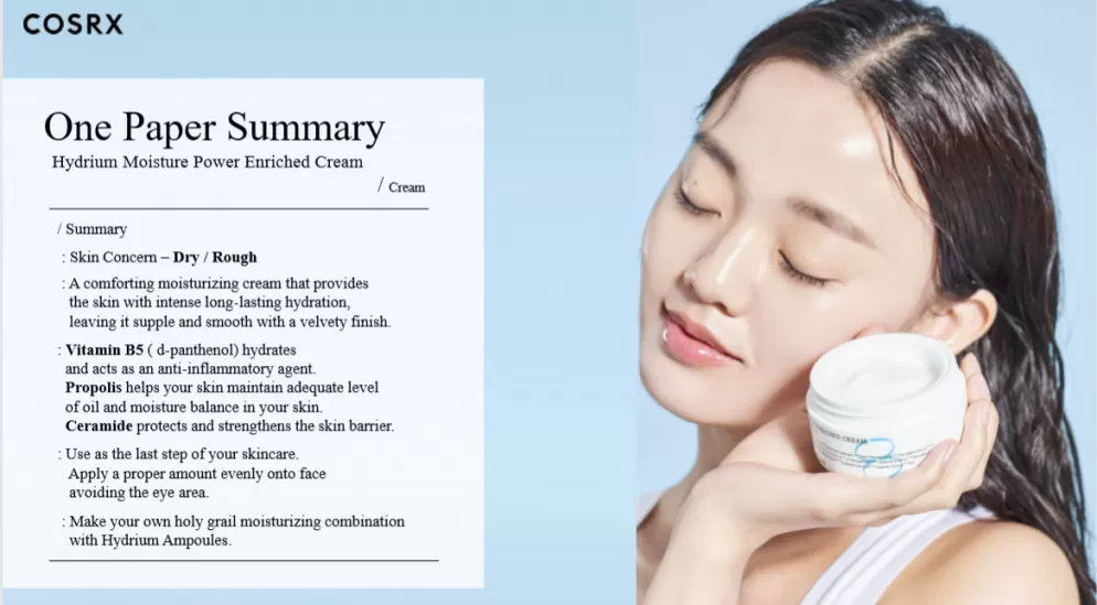 COSRX Hydrium Moisture Power Enriched Cream inneholder vitamin panthenol (Vitamin B5), propolis og ceramide som sammen gir huden rikelig med fukt og næring uten å tette igjen porene. Kremen styrker hudbarrieren og sørger for at den holder seg sunn og frisk uten å etterlate huden fet.