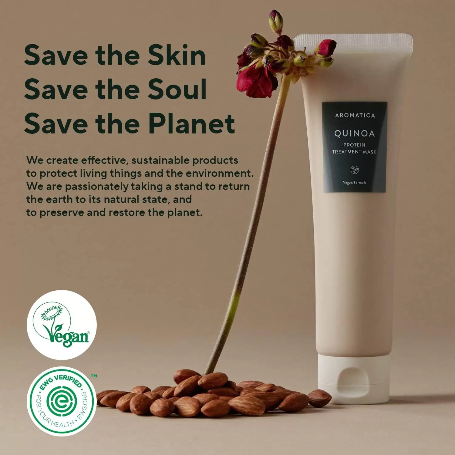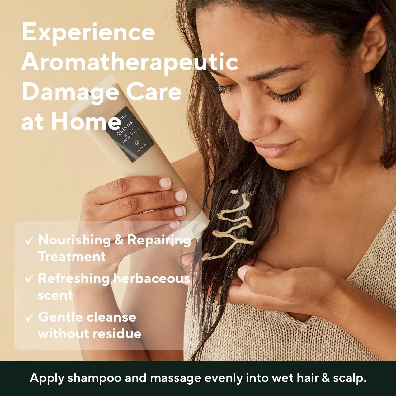 Aromatica Quinoa Protein Treatment Mask er en hårmaske som gir intens pleie til håret, en maske som inneholder proteiner, ceramider og planteoljer som reparerer skadet hår og gir den en sunn glans.