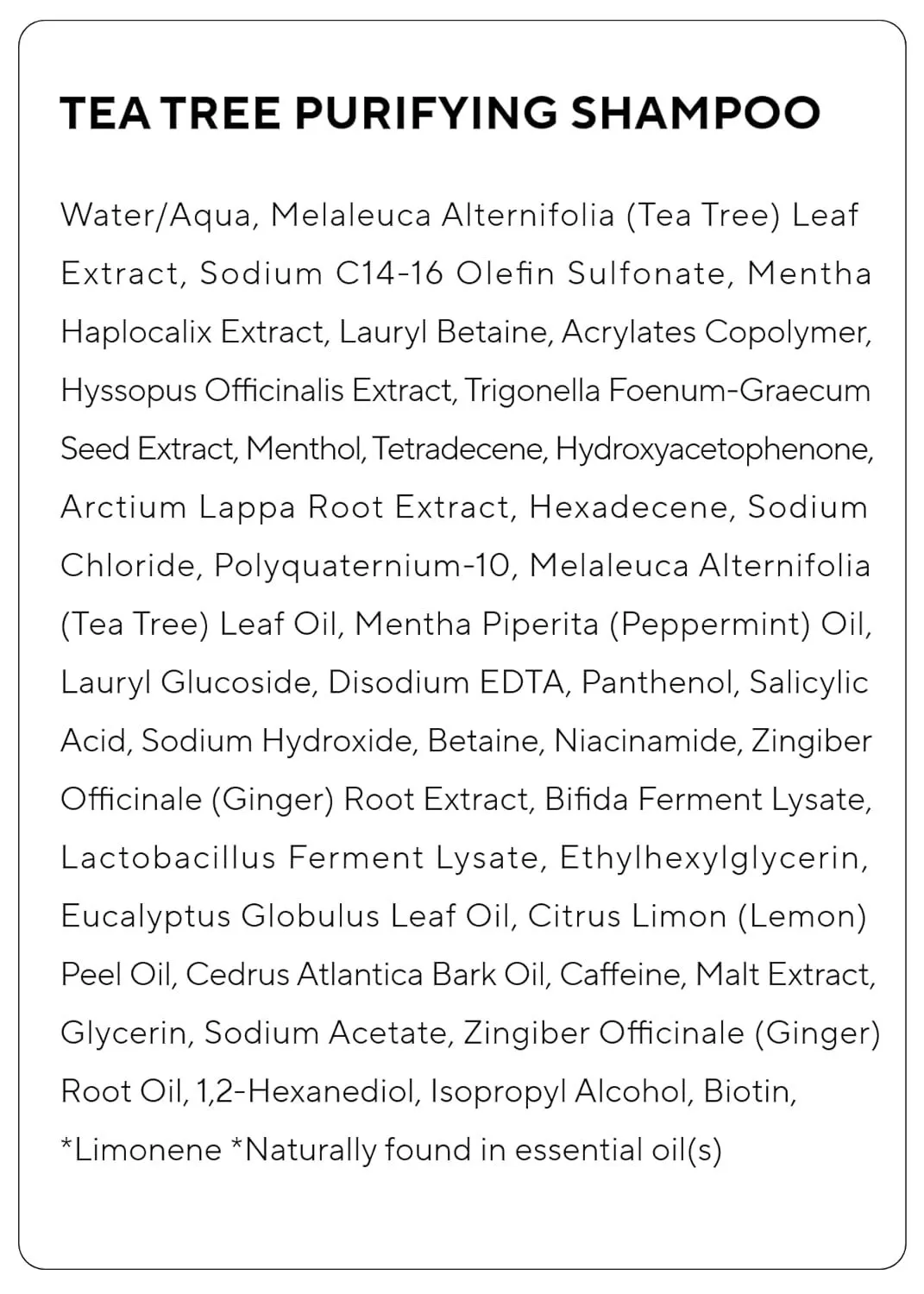 | Ingredienser | Melaleuca Alternifolia (Tea Tree) Leaf Extract (32.8%), Purified Water (Aqua), Mentha Haplocalyx Extract, Sodium Methyl Cocoyl Taurate, Sodium Cocoyl Isethionate, Sodium Cocoamphoacetate, Sodium Methyl Cocoyl Taurate, Sodium Chloride, Lauryl Glucoside, Salicylic Acid, Melaleuca Alternifolia (Tea Tree) Leaf Oil (2,496mg), Arctium Lappa Root Extract, Zingiber Officinale (Ginger) Root Extract, Zingiber Officinale (Ginger) Root Oil, Mentha Piperita (Peppermint) Oil, Eucalyptus Globulus Leaf Oil, Panthenol (Dexpanthenol), Biotin, Betaine, Hyssopus Officinalis Extract, Trigonella Foenum-Graecum (Fenugreek) Seed Extract, Dipropylene Glycol, Hydroxyacetophenone, Lactobacillus Ferment Lysate, Bifida Ferment Lysate, Caffeine, Niacinamide, Glyceryl Caprylate, Caprylyl Glycol, Polyquaternium-10, Limonene, Citrus Limon (Lemon) Peel Oil, Cedrus Atlantica Bark Oil, Malt Extract, Glycerin, Dipotassium Glycyrrhizate, Disodium EDTA, 1,2-Hexanediol, Isopropyl Alcohol, Sodium Acetate. |