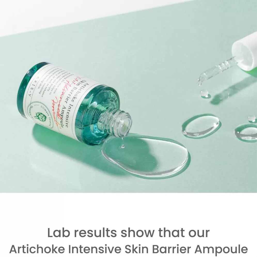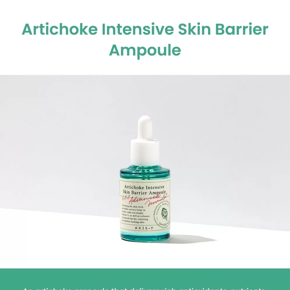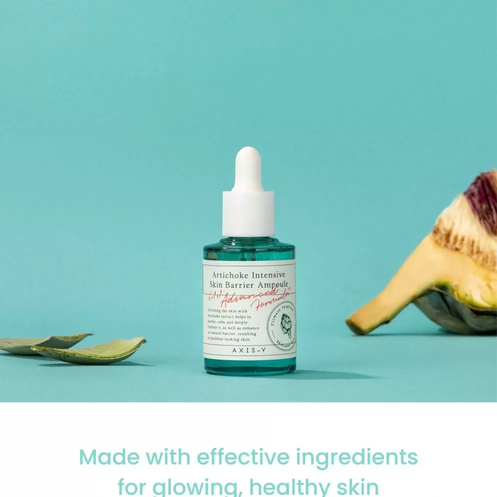 Axis-Y Artichoke Intensive Skin Barrier Ampoule er en kraftig fuktighetsgivende ampulle som inneholder 10-hyaluron syre og 6 høy kvalitets ingredienser. 10-hyaluron syre vil hydrere og låser fukten dypt inn i hudlagene og vil etterlate huden myk og glatt. Denne ampullen vil hjelpe huden å regenerere, beroliger irritert hud, styrker den naturlige hudbarrieren og balanserer sebum produksjonen i huden takket være 110.000ppm Centella Asiatica, 10.000ppm Tea Tree ekstrakt, Burdock rot, Aloe Vera, Lakris og Okra. Hovedingrediensen er ekstrakt fra artisjokk som vil hjelpe huden holde på fukt, bygge opp celleveggene som sammen med LTR teknologi vil minske størrelsen på porene.