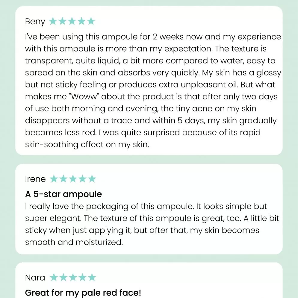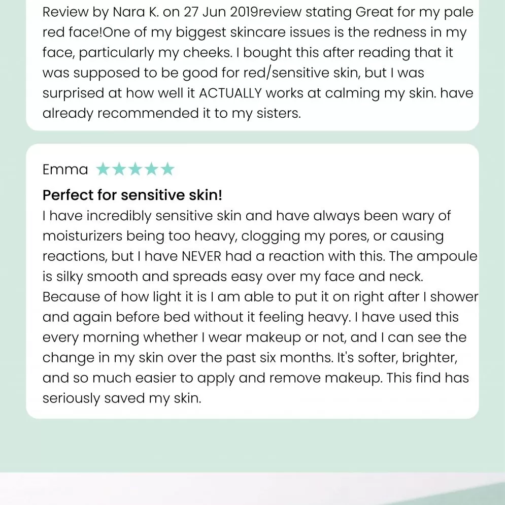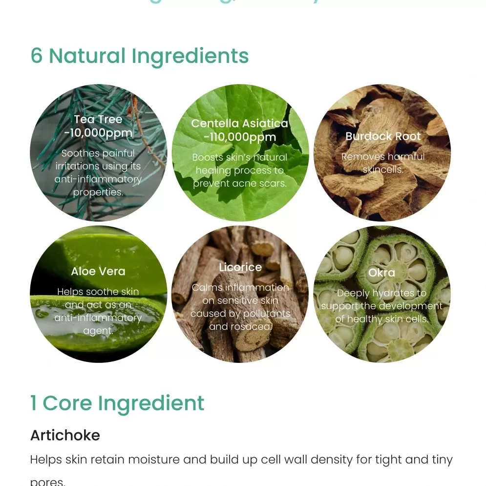 | Ingredienser | Water, Aloe Barbadensis Leaf Water, Butylene Glycol, Sodium Hyaluronate, Centella Asiatica Extract, Glycerin, Betaine, Propanediol, Glycyrrhiza Uralensis (Licorice) Root Extract, Hieracium Umbellatum Extract, Cynara Scolymus (Artichoke) Leaf Extract, Sorbitol, Aloe Barbadensis Leaf Extract, Dioscorea Japonica Root Extract, Laminaria Japonica Extract, 1,2-Hexanediol, Xanthan Gum, Carbomer, Linum Usitatissimum (Linseed) Seed Extract, Hibiscus Esculentus Fruit Extract, Aloe Barbadensis Leaf Juice, Arctium Lappa Root Extract, Hibiscus Mutabilis Flower Extract, Corchorus Olitorius Leaf Extract, Rheum Palmatum Root Extract, Althaea Rosea Flower Extract, Dimethyl Sulfone, Chlorphenesin, Ethylhexylglycerin, Polyglutamic Acid, Beta-Glucan, Arginine, Allantoin, Adenosine. |