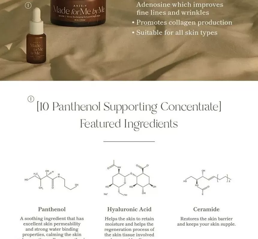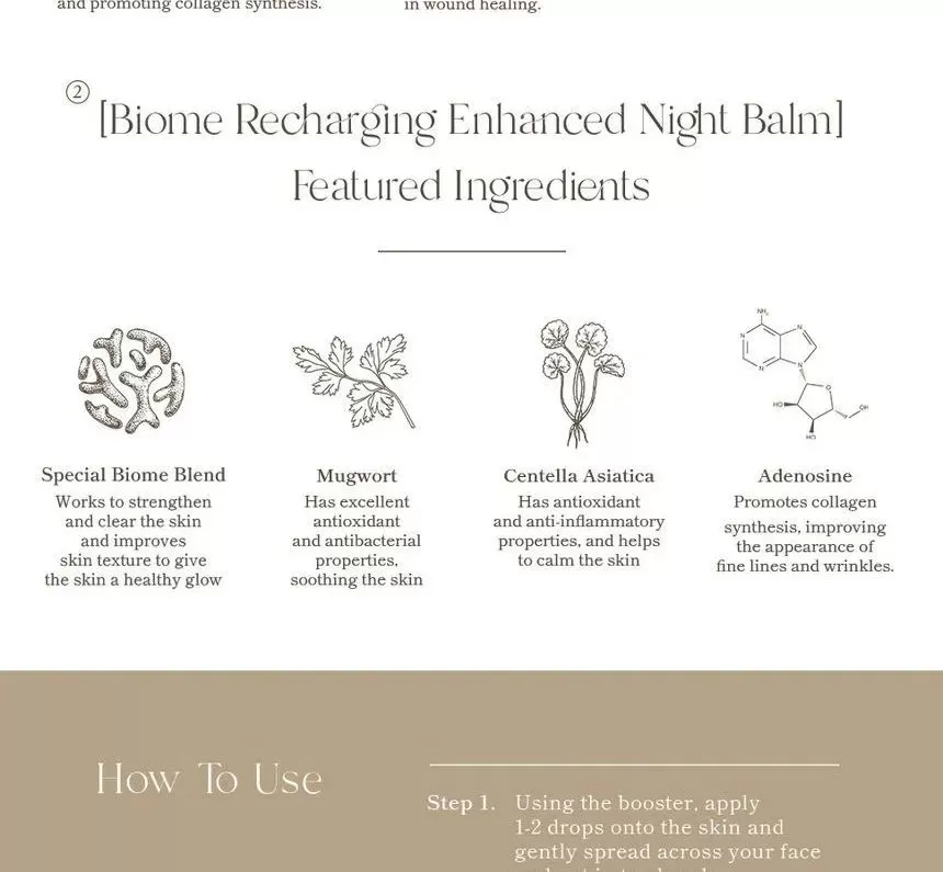 | Ingredienser | 10 Panthenol Supporting Concentrate: Water, Panthenol, Glycerin, Butylene Glycol, Betaine, Niacinamide, 1,2-Hexanediol, Bifida Ferment Lysate, Lactobacillus Ferment Lysate, Lactococcus Ferment Lysate, Saccharomyces Ferment Filtrate, Ethylhexylglycerin, Allantoin, Dipotassium Glycyrrhizate, Sodium Hyaluronate, Carbomer, Tromethamine, Hydroxyacetophenone, Fructooligosaccharides, Disodium EDTA. Biome Recharging Enhanced Night Balm: Water, Glycerin, Butylene Glycol, Caprylic/Capric Triglyceride, Betaine, Niacinamide, Hydrogenated Poly(C6-14 Olefin), Cetearyl Olivate, Sorbitan Olivate, Bifida Ferment Lysate, Lactobacillus Ferment Lysate, Lactococcus Ferment Lysate, Saccharomyces Ferment Filtrate, Centella Asiatica Extract, Artemisia Princeps Leaf Extract, Ficus Carica (Fig) Fruit Extract, Sodium Hyaluronate, Panthenol, Squalane, Ceramide NP, Cetearyl Alcohol, Polyglyceryl-10 Laurate, Arginine, Carbomer, Allantoin, Adenosine, Ethylhexylglycerin, Caprylyl Glycol, Fructooligosaccharides, Hydroxyacetophenone, Disodium EDTA. |