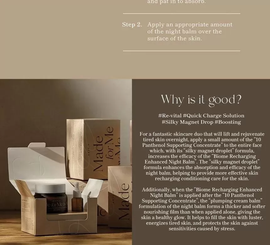 En fantastisk hudpleieduo som vil løfte og forynge matt og sliten hud over natten, påfør en liten mengde av "10 Panthenol Supporting Concentrate" i hele ansiktet, som med sin silkeaktige "magnetdråpe" formel øker effektiviteten til Biome Recharging Enhanced Nattbalsam. Formelen med silkeaktig "magnetdråpe" forbedrer absorpsjonen og effektiviteten til nattbalsamen, og hjelper til med å gi en mer effektiv hud "oppladning" pleie for huden. Når Biome Recharging Enhanced Night Balm påføres etter 10 Panthenol Supporting Concentrate, danner den "plumping cream balm"-formuleringen av nattbalsamen en tykkere og mykere nærende film enn når den påføres alene. Settet bidrar til å fylle huden med glans, gir energi til sliten hud og beskytter den mot følsomhet forårsaket av stress.