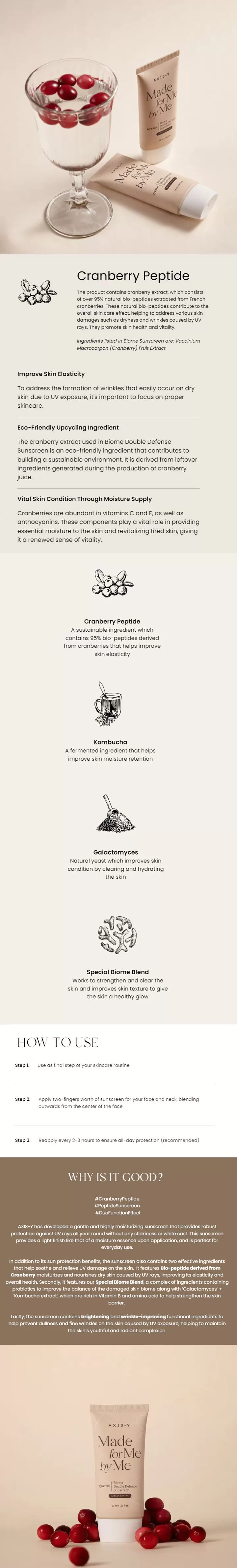 Axis-Y Biome Double Defense Sunscreen er en bredspekter solkrem med SPF50+ PA++++ beskyttelse året rundt. En solkrem som inneholder ingredienser som er beroligende, som vil hjelpe huden å holde sin elastisitet, passe på at huden holder seg fuktig og jevner ut hudtonen. En behagelig solkrem som føles som en fuktighetskrem, ikke klebrig og selvfølgelig etterlater denne ingen whitecast.
