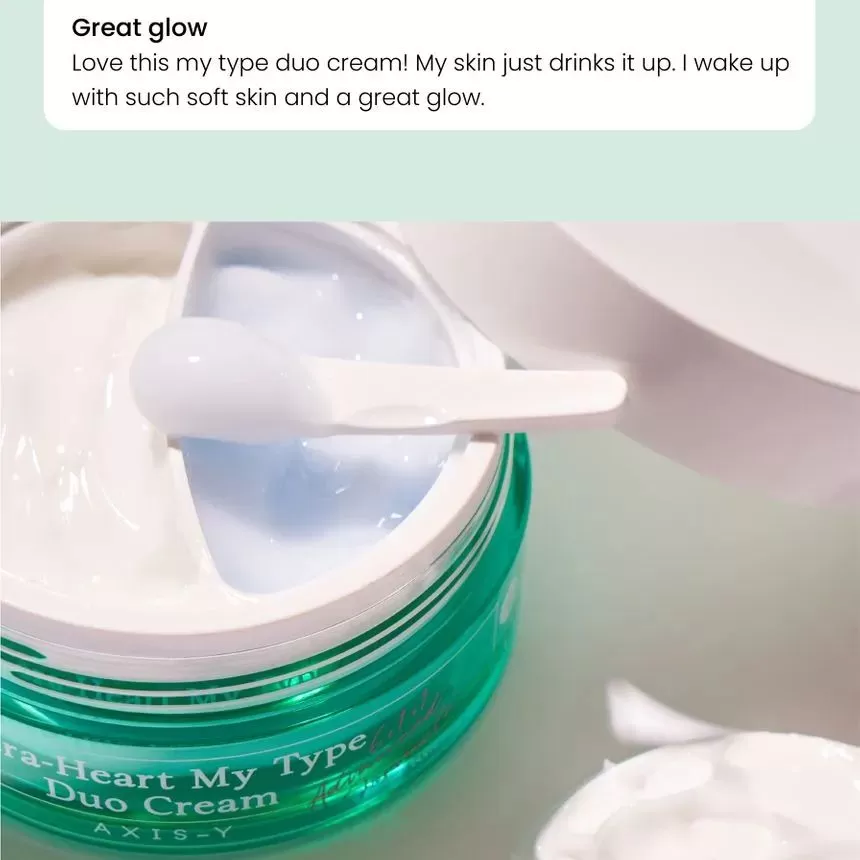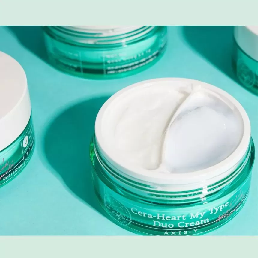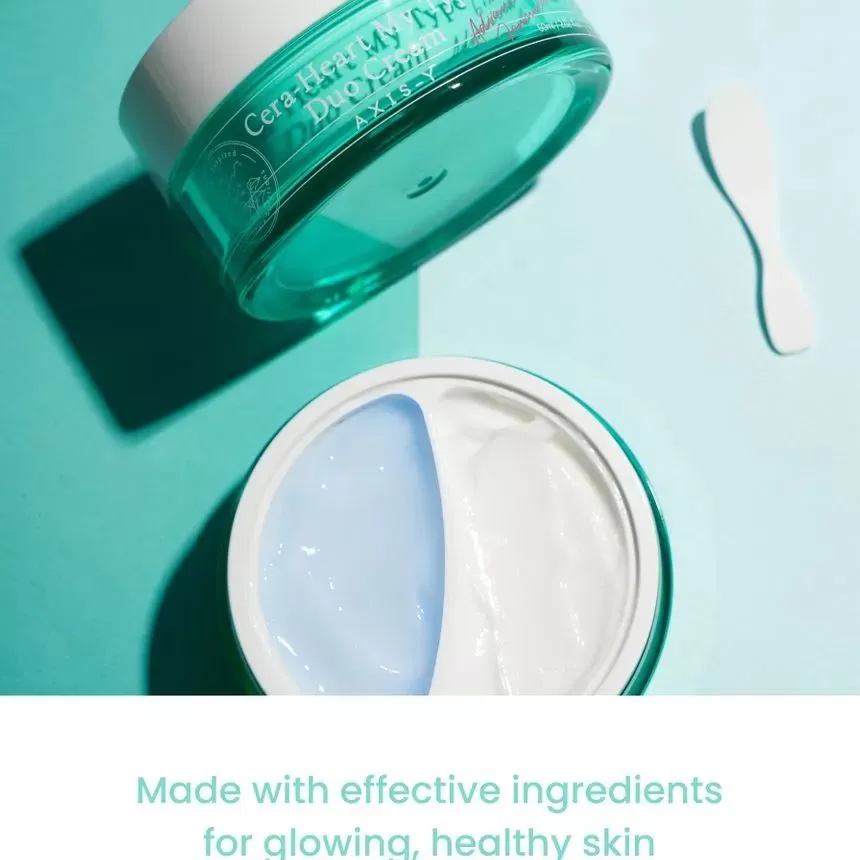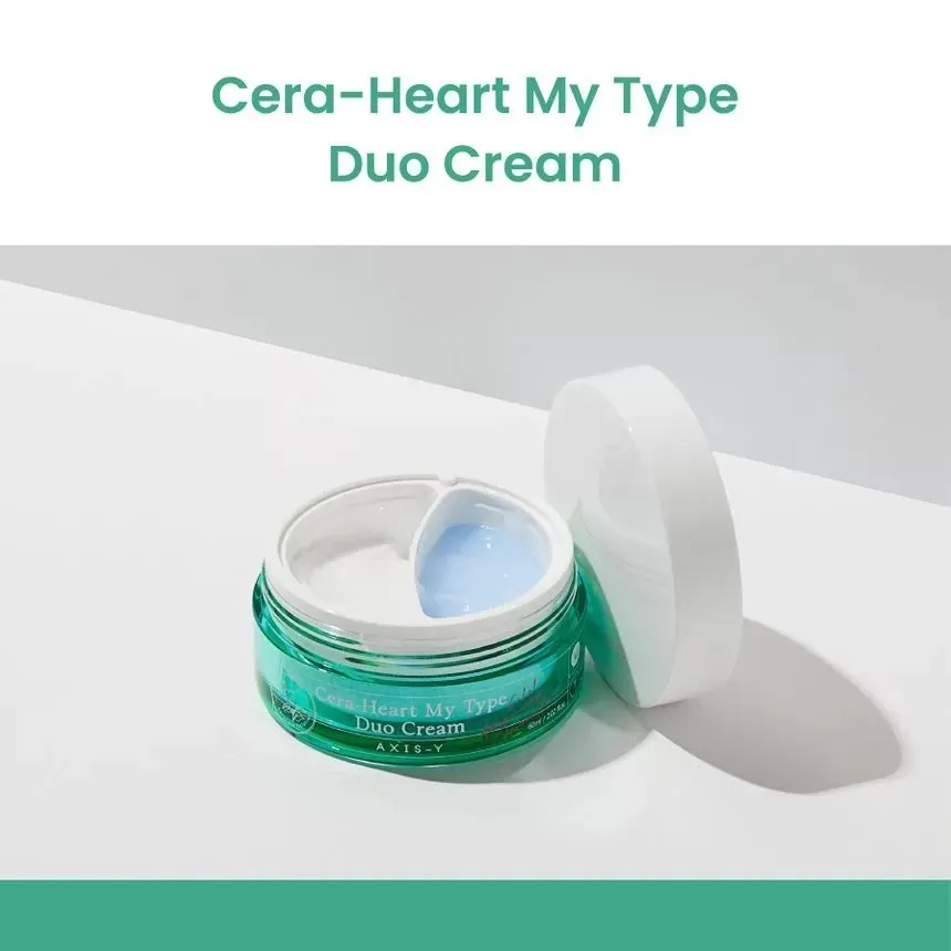 Axis-Y Cera- Heart My Type Duo Cream er en dobbelkrem for deg med kombinert hud, den ene kremen er for tørre partier og den andre kremen er for oljete/fete partier. Den blå gel-kremen er til fet hud og den hvite kremen er til tørr hud. En krem som vil gjøre det enklere for deg med kombinasjonshud å tilpasse hudrutinen.