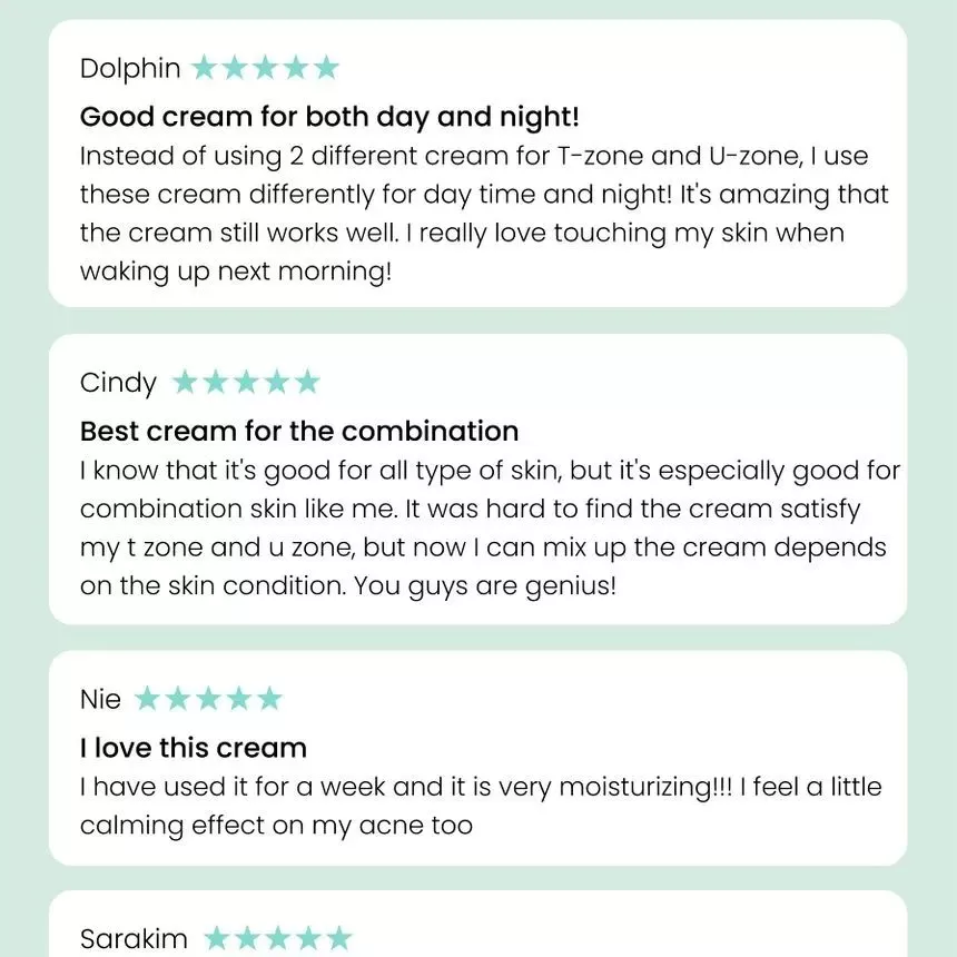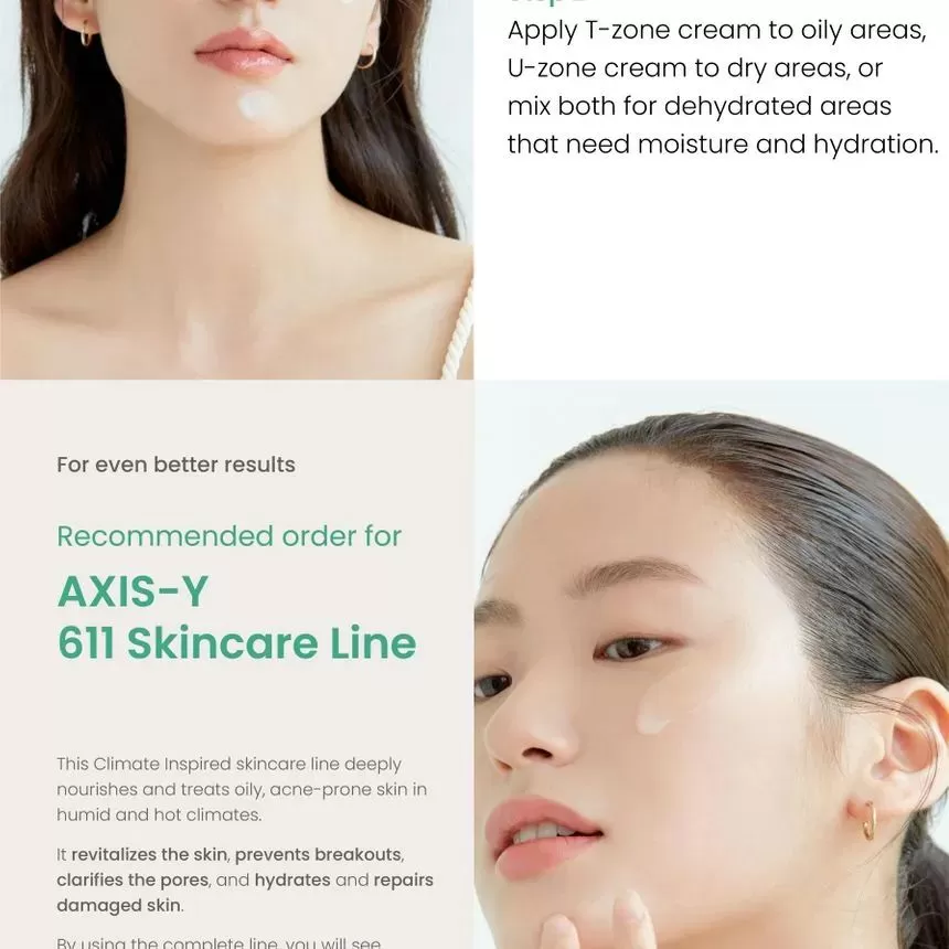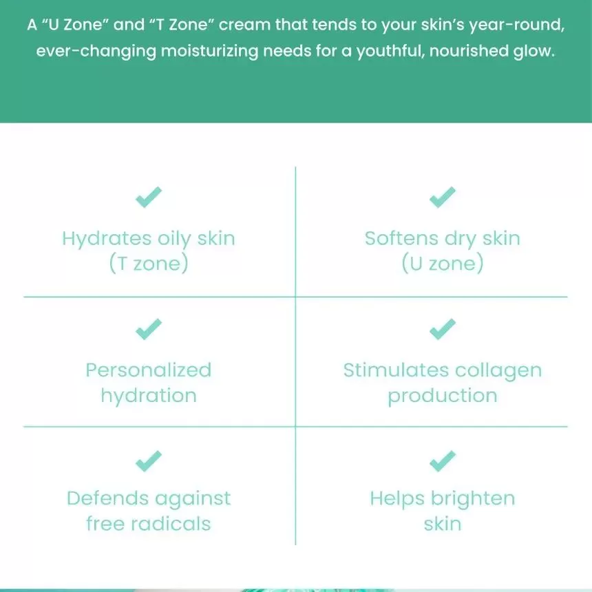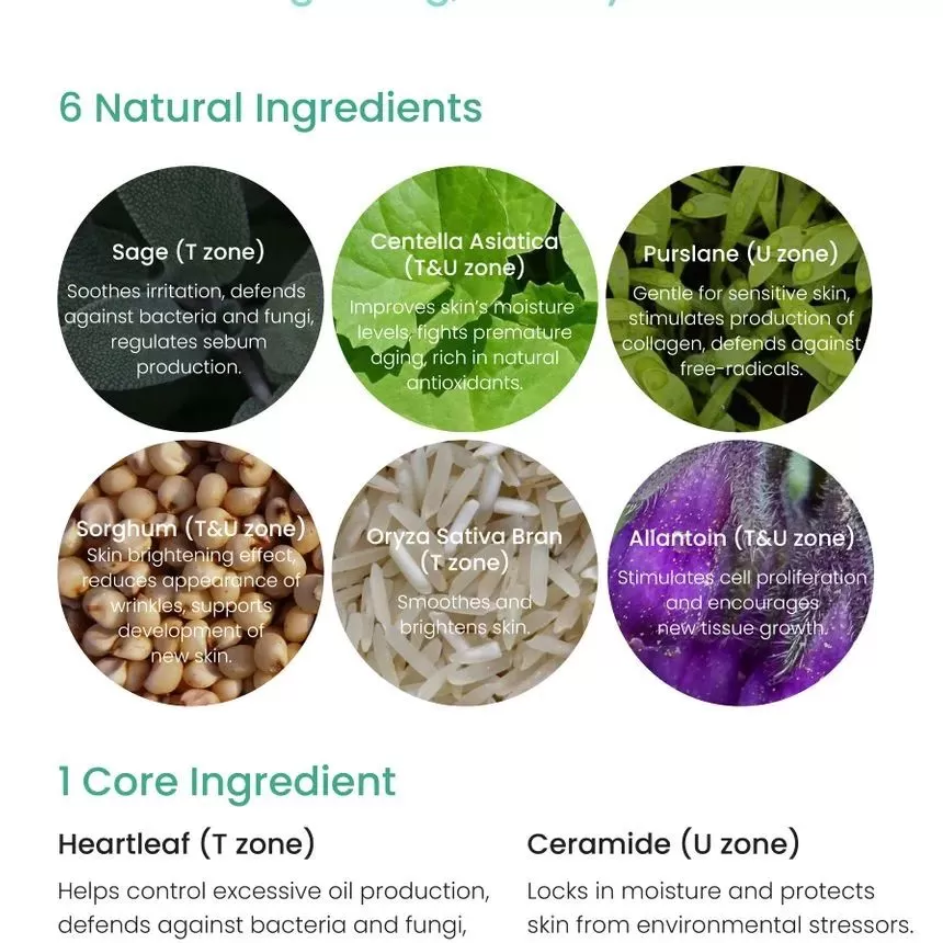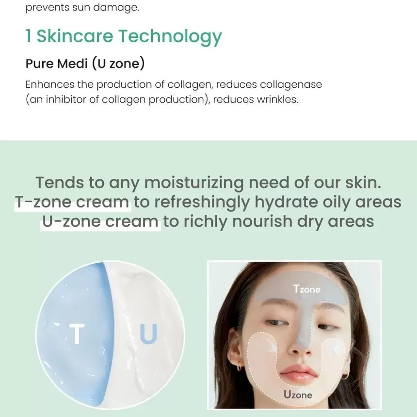 | Ingredienser | T-Zone (blå): Water (Aqua), Propanediol, Glycerin, Sodium Hyaluronate, Butylene Glycol, Sorbitol, Isohexadecane, Caprylic/Capric Triglyceride, Houttuynia Cordata Extract, Betaine, Centella Asiatica Extract, Glyceryl Stearate SE, Salvia Officinalis (Sage) Extract, Glycyrrhiza Glabra (Licorice) Root Extract, Sorghum Bicolor Leaf/Stem Extract, Aspergillus Ferment, Chlorphenesin, Arginine, Acrylates/C10-30 Alkyl Acrylate Crosspolymer, Allantoin, Sorbitan Sesquioleate, Ethylhexylglycerin, Xanthan Gum, Guaiazulene U-Zone (hvit): Water (Aqua), Butylene Glycol, Glycerin, Cetyl Ethylhexanoate, Simmondsia Chinensis (Jojoba) Seed Oil, Isohexadecane, Sodium Hyaluronate, Ceramide NP, Sorbitan Stearate, Glyceryl Stearate SE, Microcrystalline Wax, Sorbitol, Centella Asiatica Extract, Sorbitan Sesquioleate, Aspergillus Ferment, Portulaca Oleracea Extract, Salicornia Herbacea Extract, Phragmites Communis Extract, Chlorphenesin, Arginine, Carbomer, Xanthan Gum, Allantoin, Ethylhexylglycerin |