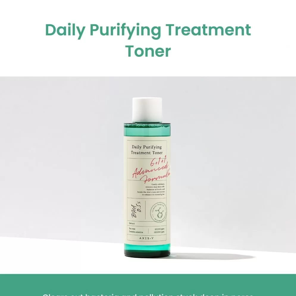 Axis-Y Daily Purifying Treatment Toner er en alkoholfri toner som bekjemper bakterier og forurensing dypt ned i porene og redusere irritasjon og akne. Inneholder AHA og PHA for en skånsom kjemisk eksfoliering, Centella Asiatica vil berolige huden. En toner som vil hjelpe huden å heles fra akne/kvise utbrudd.