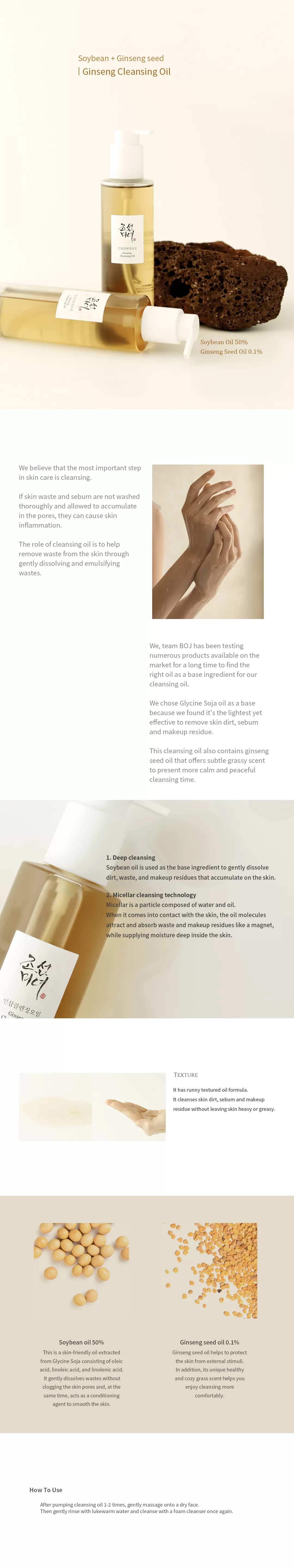 Beauty of Joseon Ginseng Cleansing Oil er en effektiv og skånsom oljerens som løser opp smuss, urenheter og sminkerester. Denne oljerensen er basert på soyaolje og bruker Micellar renseteknologi. Micellar bruker en kombinasjon av vann og olje, som ved kontakt med huden vil molekylene tiltrekke og absorberer avfall/urenheter og sminkerester som en magnet, teknologien passer også på å tilføre huden rikelig med fukt. Denne rensen inneholder også ginseng frø olje som vil styrke og beskytte huden mot ytre påvirkninger, denne oljen vil også gi rensen en naturlig og behagelig gressduft.