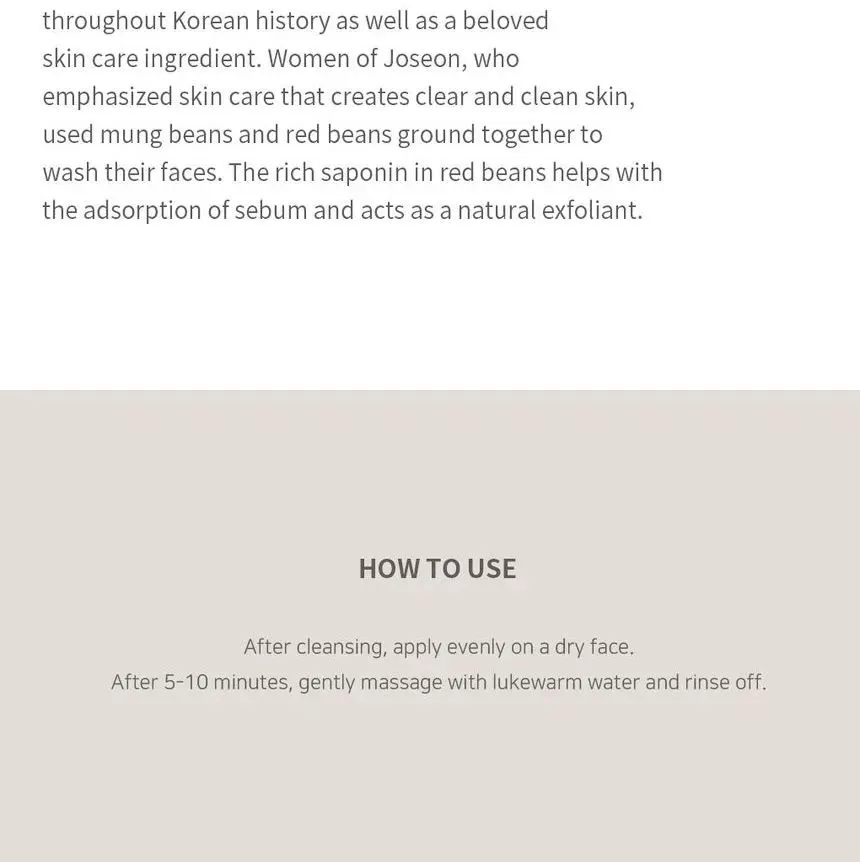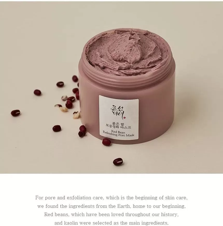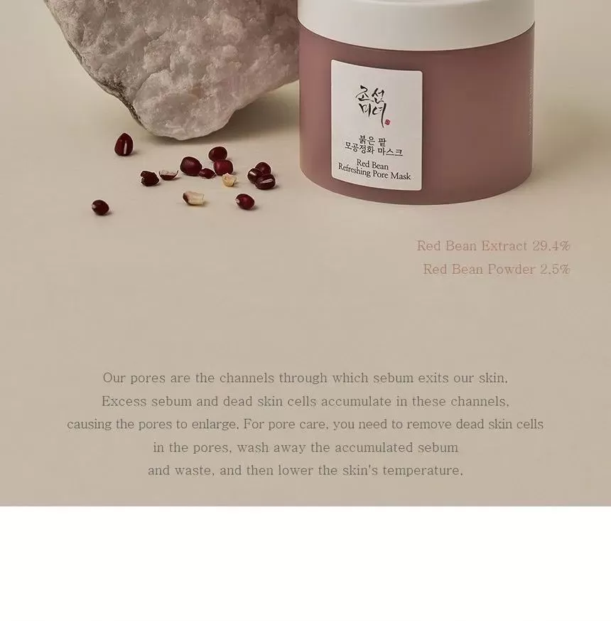 Beauty of Joseon Red Bean Refreshing Pore Mask er en eksfolierende og porerensende ansiktsmaske som inneholder rød-bønneekstrakt og rød-bønnepulver. Denne ansiktsmasken vil klarne opp huden og kaolinleiren vil hjelpe til med overflødig sebum/talg for et et forfriskende resultat. Masken har en myk konsistens som effektivt vil fjerne urenheter og rense porene uten å tørke ut huden. Brukes etter rens, påfør en god mengde på renset tørr hud, la den virke i 5-10minutter, skyll av med lunkent vann.
