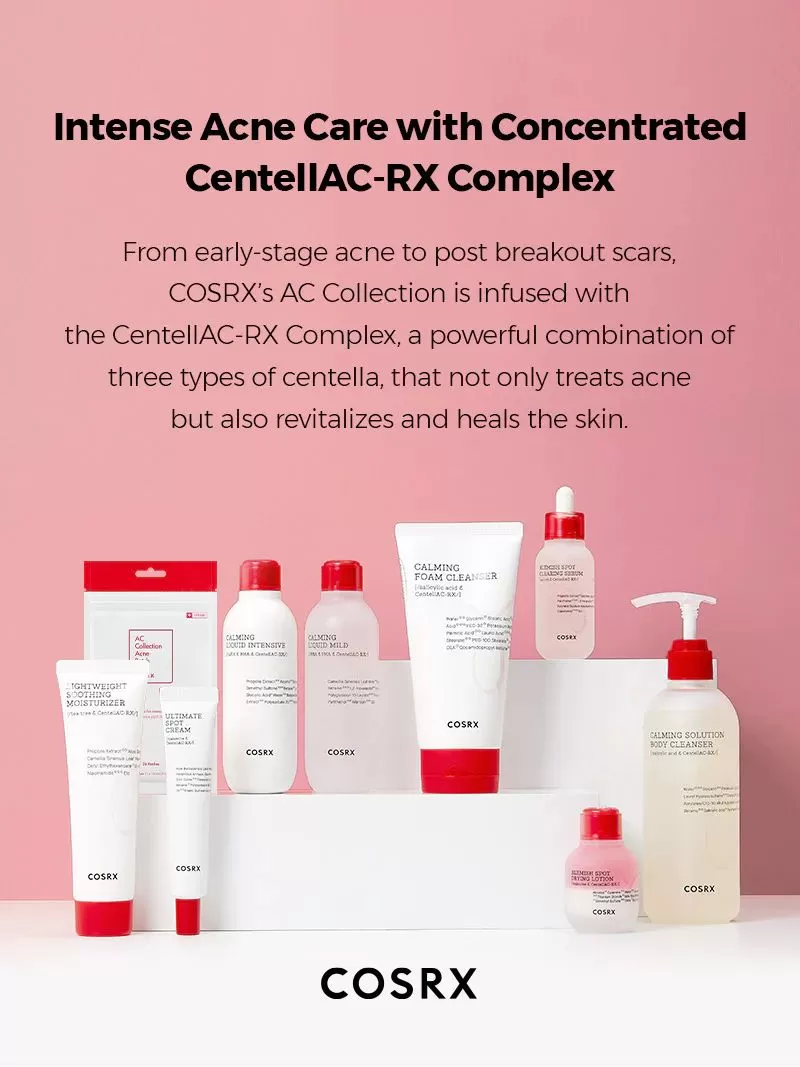 COSRX AC Collection Blemish Spot Clearing Serum er en serum utviklet for å behandle akneutsatt hud, berolige huden og roe ned kløe i huden. Serumet inneholder COSRX sin egenutviklede CentellAC RX-comlex som ikke bare behandler/reduserer kviser/akne men hjelper også huden å helbrede slik at man har mindre sjanse for akne arr. CentellAC RX-complex består av 3 ingredienser; Madecassic syre, Asiaticoside og Asiatic syre. Serumet inneholder i tillegg 4% Niacinamid som reduserer pigmentering forårsaket av akne/kviser og vil jevne ut hudtonen. 85.6% Propolis ekstrakt fungerer som base og har dokumentert effekt mot kviser og akne. Serumet inneholder også superingrediensen EGF som øker hudens kollagenproduksjon og vil gjøre den mer elastisk
