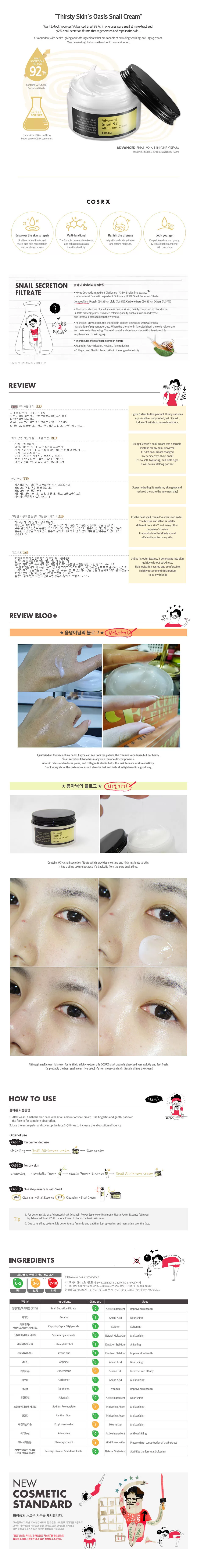 COSRX Advanced Snail 92 All In One Cream er en fuktighetskrem som inneholder 92% filtrert sneglesekresjon som har helbredende egenskaper og roer ned irritert hud. Denne hudkremen tilfører huden fukt, er beskyttende og gir den en naturlig glød. Denne hudkremen vil også redusere akne arr og reduserer pigmentflekker.