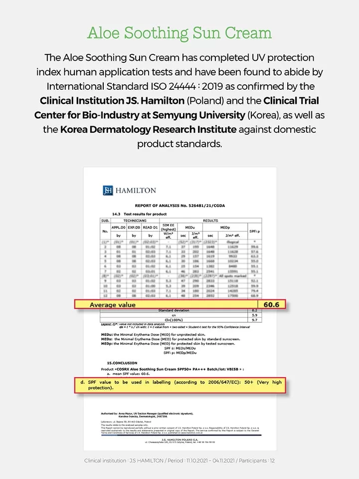 COSRX Aloe Soothing Sun Cream SPF50 PA+++ er en bredspekter SPF50+ solkrem som beskytter mot UVA og UVB stråling, denne lette solkremen absorberes raskt og styrker den naturlige hudbarrieren ved hjelp av Aloe Vera. Denne er meget lett å påføre uten at den etterlater seg den kjente hvite hinnen man ofte får fra solkremer. Denne solkremen er skånsom og kan også brukes av de med sensitiv hud.