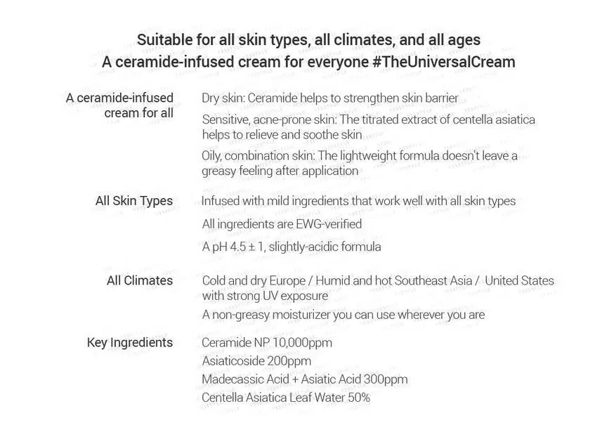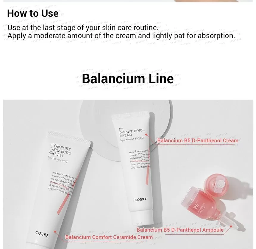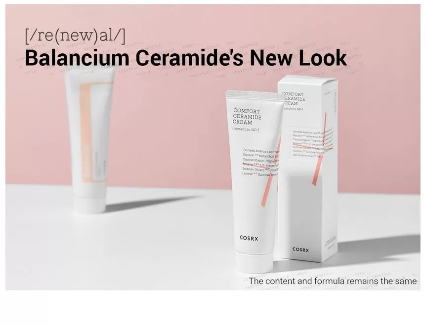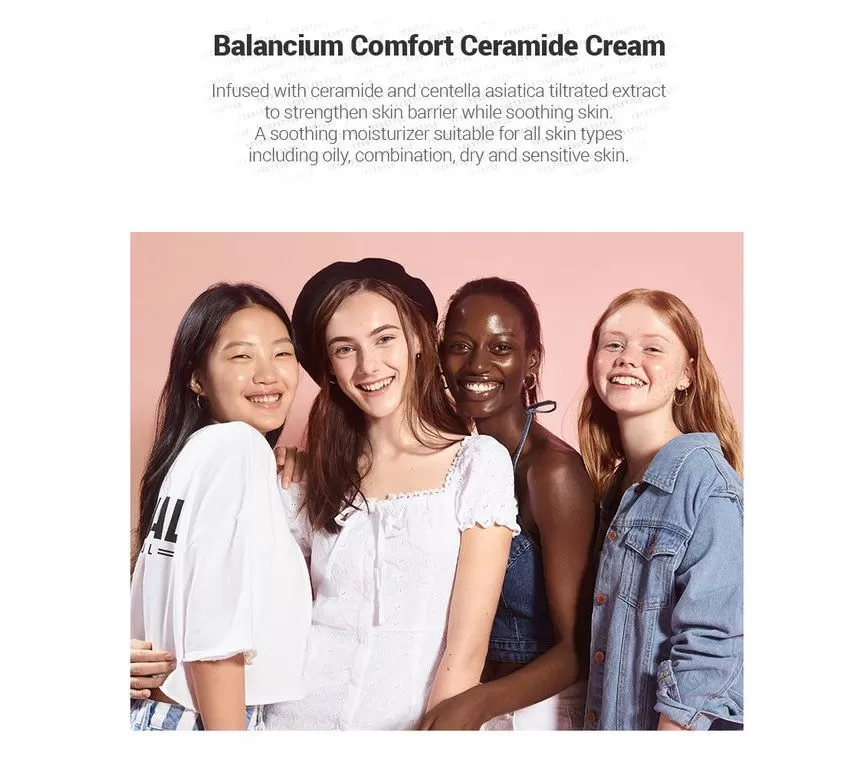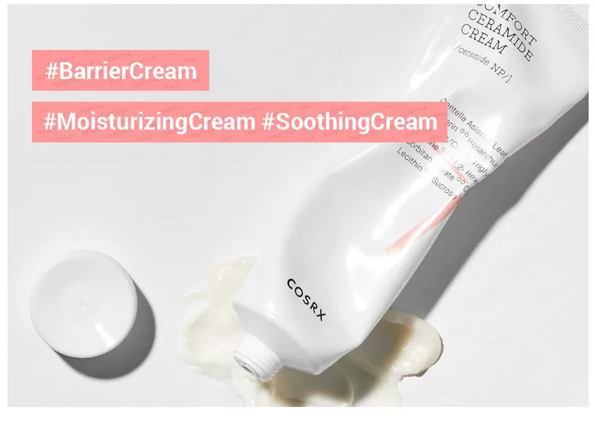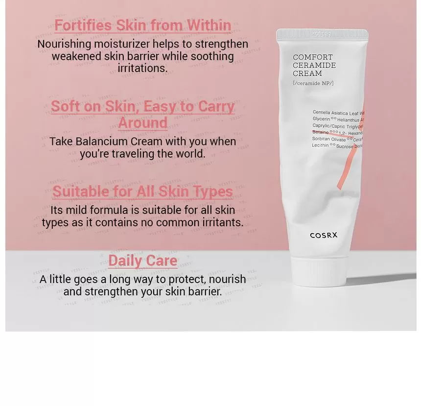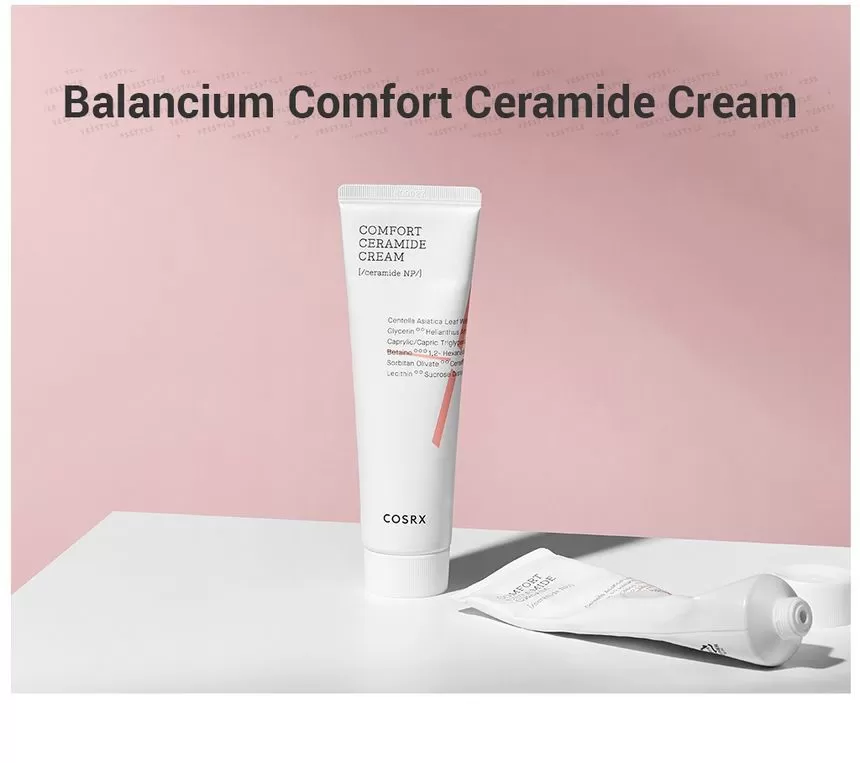 COSRX Balancium Comfort Ceramide Cream er en fuktighetskrem mot tørr hud som kan brukes som både dagkrem og nattkrem. Inneholder Centella Asiatica og Ceramider som hjelper huden å holde på fuktighet ved å styrke hudbarrieren, samt roer ned sensitiv, rød og irritert hud. Kremen er tykk men etterlater ikke huden glinsende eller fet, men bruker litt tid på å trekke inn i huden.