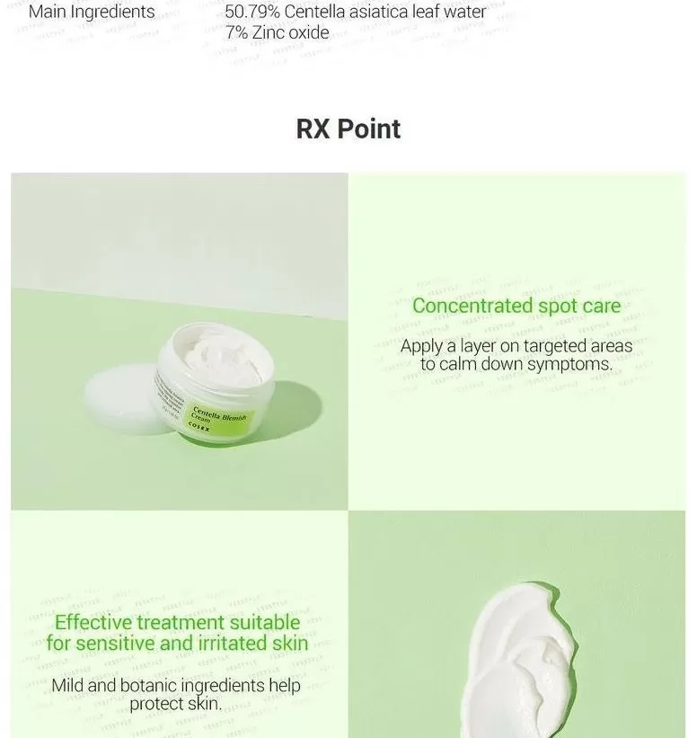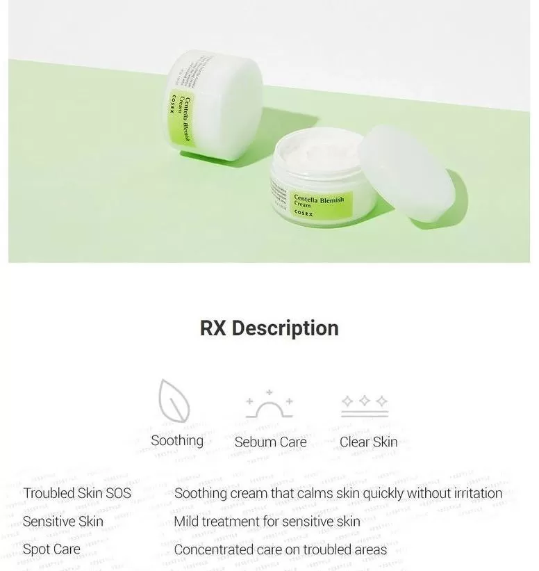 COSRX Centella Blemish Cream er en ansiktskrem som fukter huden, reduserer synligheten av kviser, urenheter og kvise arr. Kremen inneholder Centella Asiatica som er kjent for å bekjempe akne og ha en beroligende effekt.