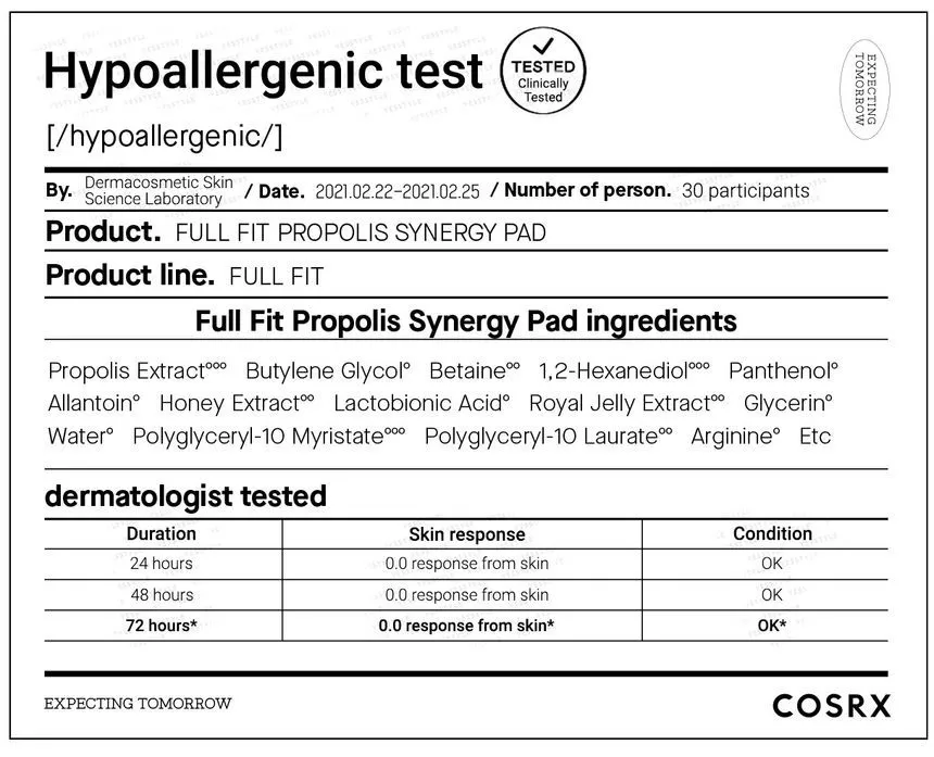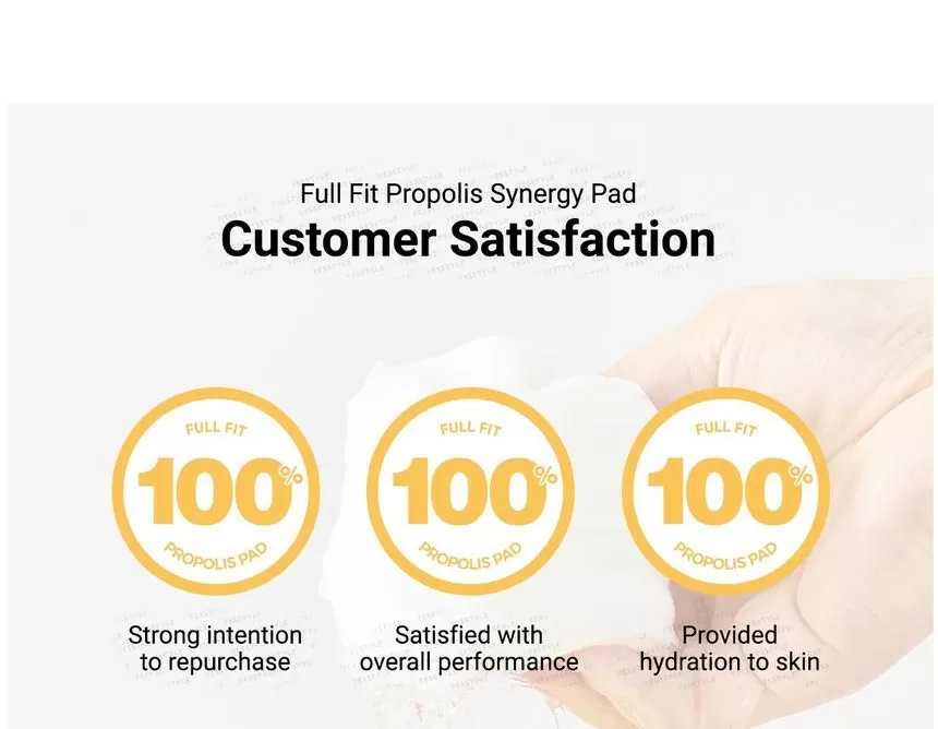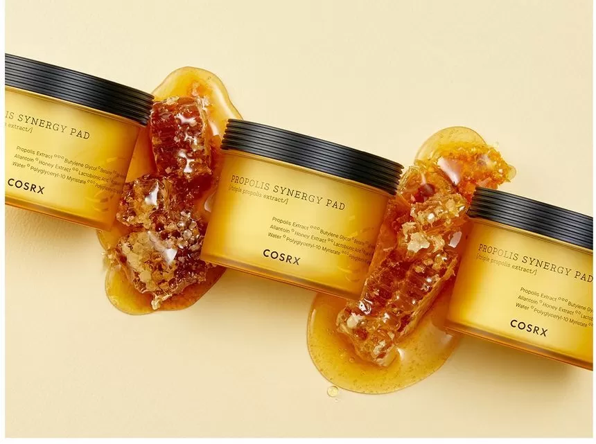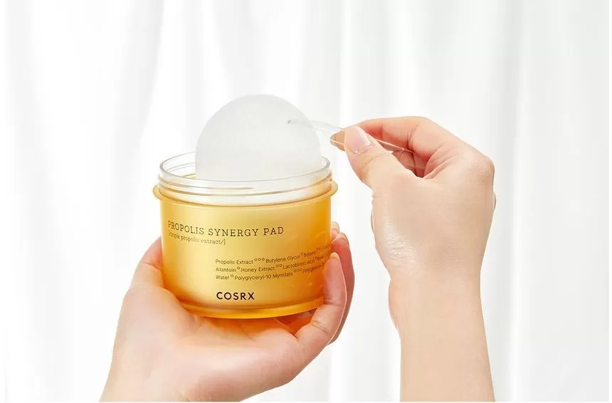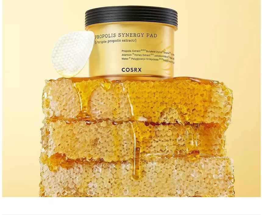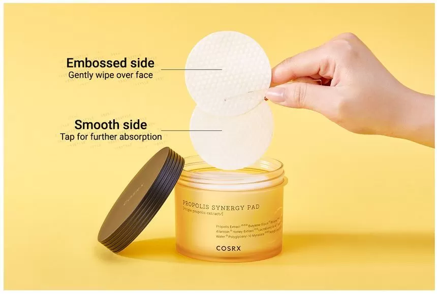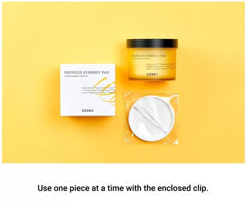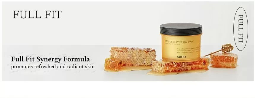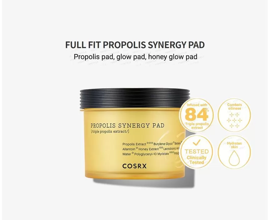 COSRX Full Fit Propolis Synergy Pad er store bomull-pads fylt med antiinflammatorisk og antibakteriell toner som styrker hudbarrieren. Inneholder 84% propolis ekstrakt som gir huden fuktighet og en naturlig glød. Toneren i padsene absorberes raskt av huden og etterlater huden med naturlig glød. Denne er også mild eksfolierende.