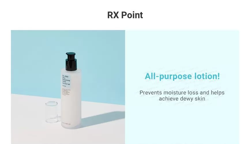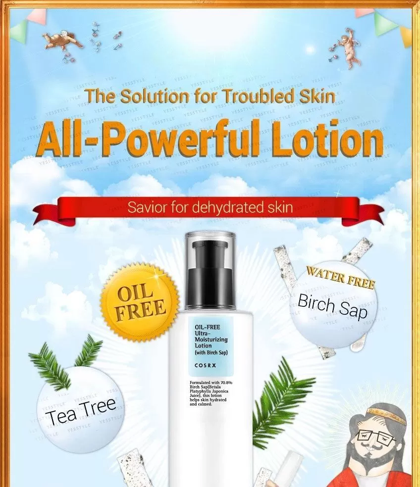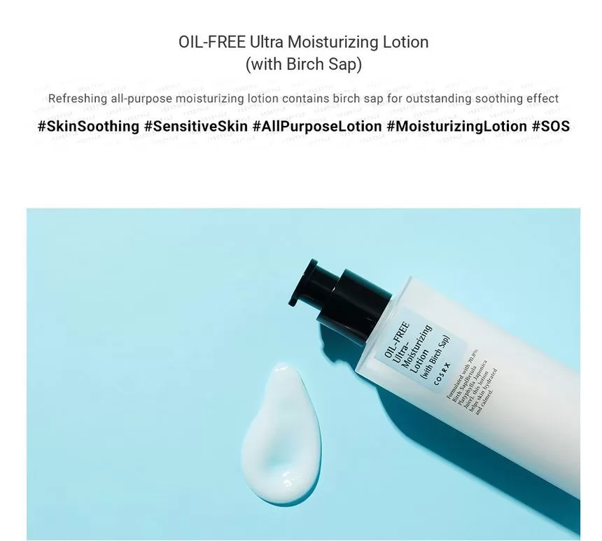 COSRX Oil-Free Ultra-Moisturizing Lotion er en oljefri lotion med 70% Birch Sap (Bjørkesevje) som er rik næring og antioksidanter. En lotion som er beroligende og balanserer huden. Utviklet for sensitiv, fet og/eller akne utsatt hud, som balanserer fuktighetsbalansen og talgproduksjonen i huden. Resultatet er en rolig, myk hud med forbedret tekstur og tone. Tilfør en liten mengde på rensket hud etter toner.