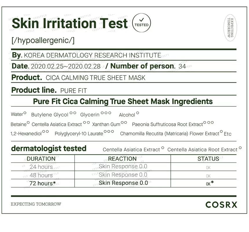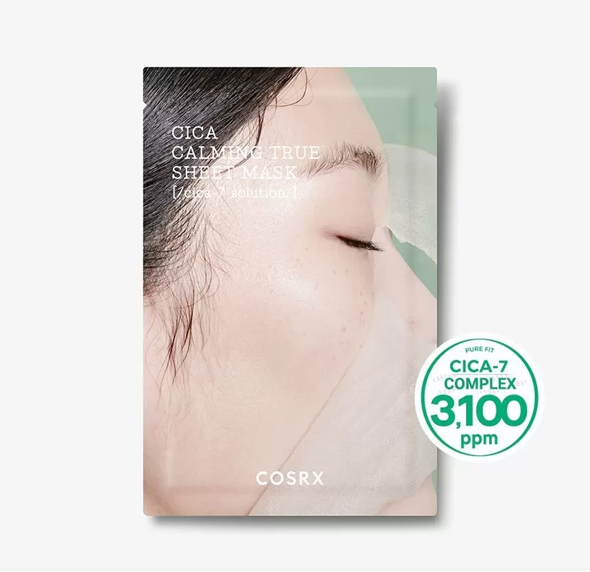 COSRX Pure Fit Cica Calming True Sheet Mask er en mild og beroligende ansiktsmaske, med hele 7 ulike typer av centella asiatica. Utviklet for å roe sår, irritert og følsom hud. Sheet masken er anti-inflammatorisk med et høyt innhold av antioksidanter og er derfor perfekt for deg med følsom, irritert eller akne utsatt hud.