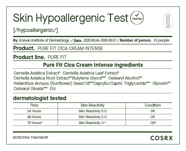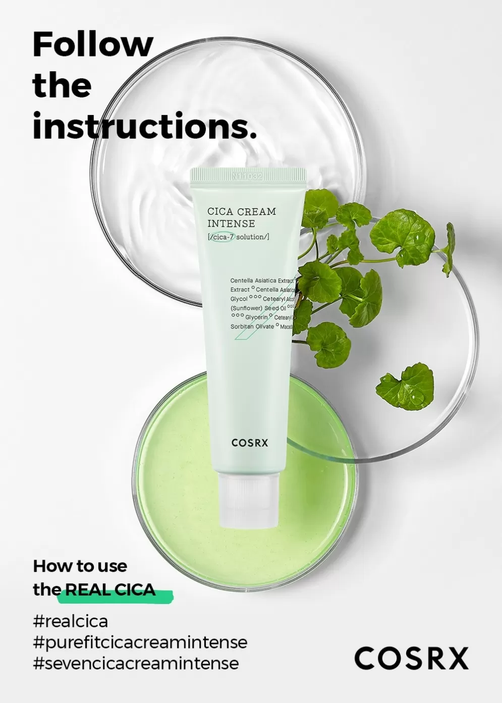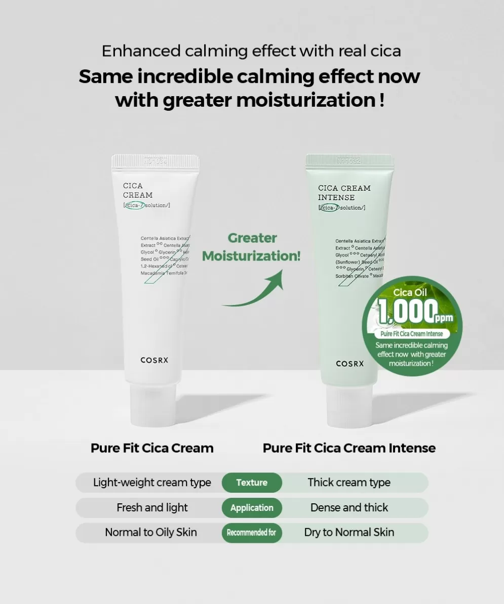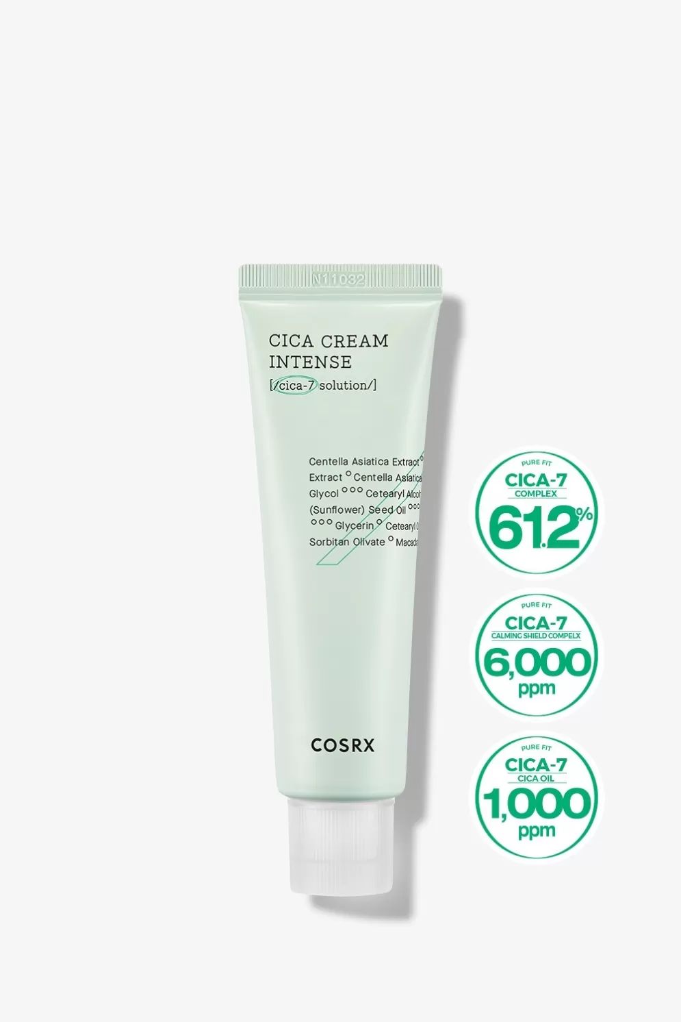 COSRX Pure Fit Cica Cream Intense er en pleiende fuktighetskrem som umiddelbart behandler og roer ned rødhet og irritert hud. Kremen inneholder 61.2% Pure Fit CICA-7 kompleks som kommer fra Centella Asiatica, samt ekstrakter fra bladene og røtter av Asiaticoside, Madecassic Acid, Madecassoside og Asiatic Acid. Denne kremen er spesielt utviklet for å reparere og styrke hudbarrieren, gi huden godt med fukt og behandle irritert og rød hud. Denne kremen er tykkere enn Pure Fit Cica Cream og inneholder i tillegg Cica olje noe som gjør at denne er bedre egnet til tørr hud.