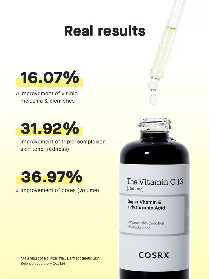 COSRX The Vitamin C 13 serum er en høykonsentrert Vitamin C serum utviklet for å behandle matt/sliten, røff, fine-linjer (well-aging), arr og hud med ujevn hudtone. Inneholder ren 13% Vitamin C i form av askobinsyre som er en av de mest aktive og reneste formene av Vitamin C og fungerer utmerket mot aldringstegn mens den også jevner ut hudtonen, tocotrienol (Super Vitamin E) vil også hjelpe til mot fine-linjer og er en effektiv well-aging ingrediens, Hyaluronsyre vil tilføre huden rikelig med fukighet, Allantoin vil berolige og beskytte huden. Hyaluronsyre for å tilføre huden fuktighet. Denne utgaven er en mildere en C 23 og bedre egnet til daglig bruk.