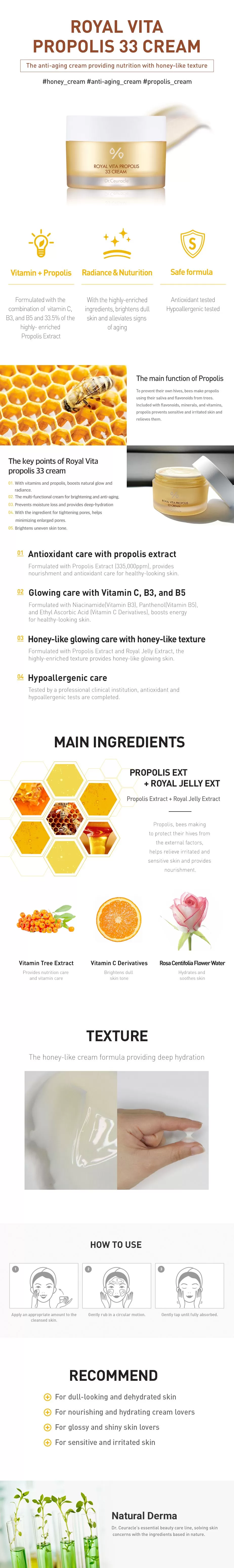 Dr.Ceuracle Royal Vita Propolis 33 Cream er en fuktighetskrem som reparerer og gir rikelig med næring til sliten/matt hud takket være royal jelly ekstrakt og 33% ren propolis eksrakt - Ingredienser som tilfører huden naturlig kollagen som vil forbedre fastheten. Panthenol vil berolige huden og sørge for en styrket hudbarriere, havtornekstrakt vil jevne ut hudtonen og lyse opp pigmenteringer.