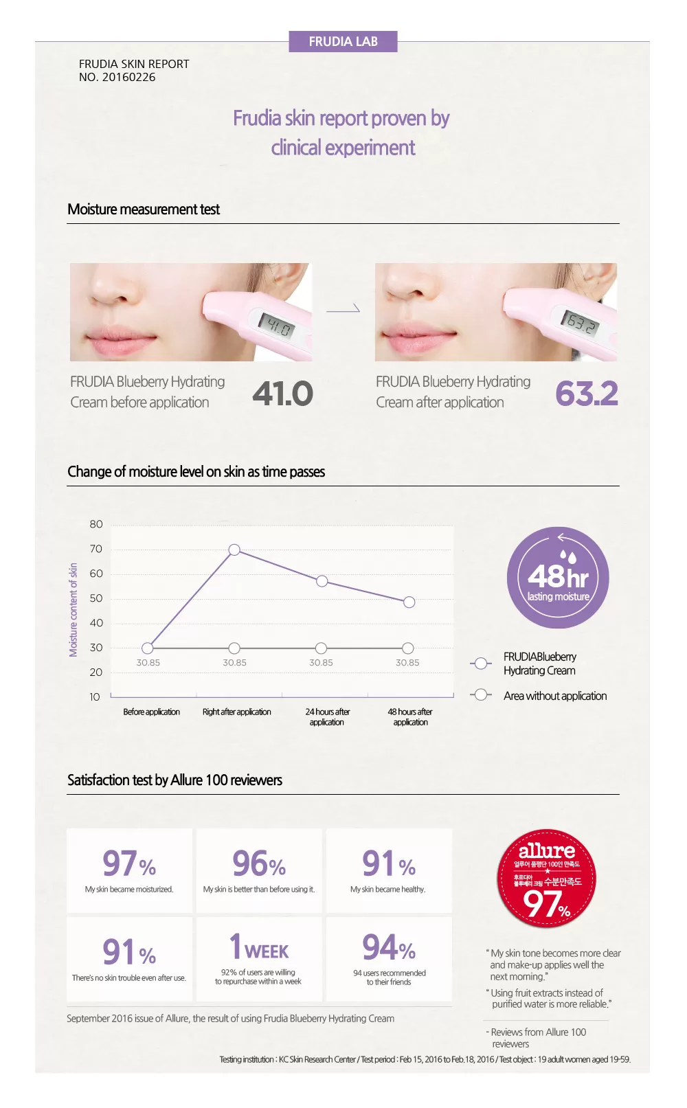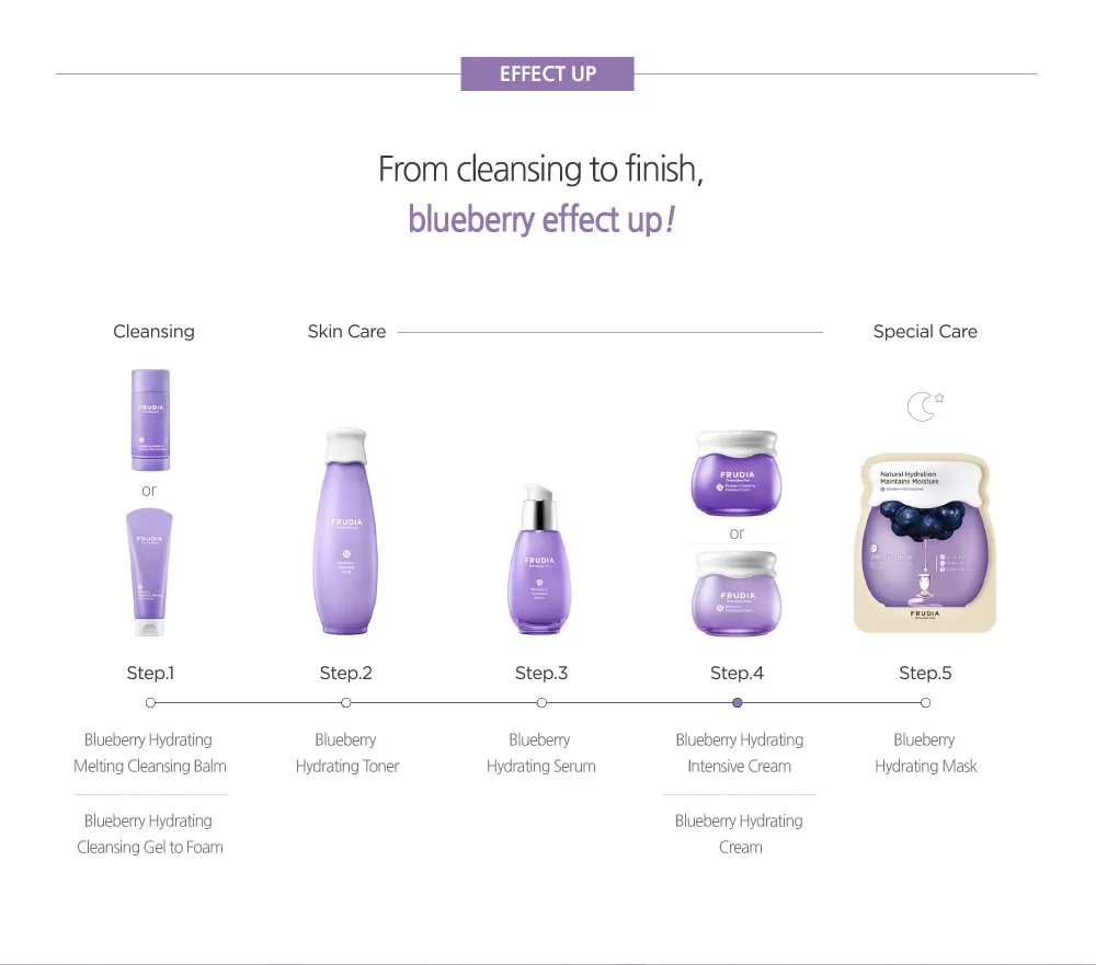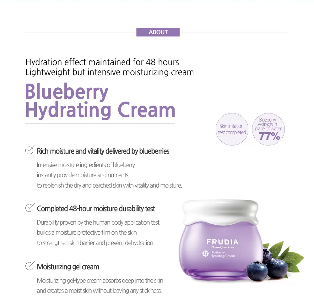 Frudia Blueberry Hydrating Cream er en hydrerende hudkrem som lindrer tørrhet og vitaliserer huden med hjelp av 77% blåbærekstrakt. Blåbær er en rik kilde til vitamin C og E som er kjent for å fjerne døde hudceller fra epidermis (overhuden), stimulerer fornyelse av hudcellene, fremmer en jevnere, lysere og mer spenstig hud. Blåbærekstrakt inneholder også antocyaniner som lindrer fotoaldring og effekten av UV stråling. Denne hudkremen inneholder ingridienser som blant annet glyserin, granatepleolje, druefrøolje og grapefruktfrøolje som vil fukte huden dypt, gi den rikelig med næring, styrker den naturlige hudbarrieren, forbedrer synligheten av fine linjer (well-aging) og livner opp mat hud.