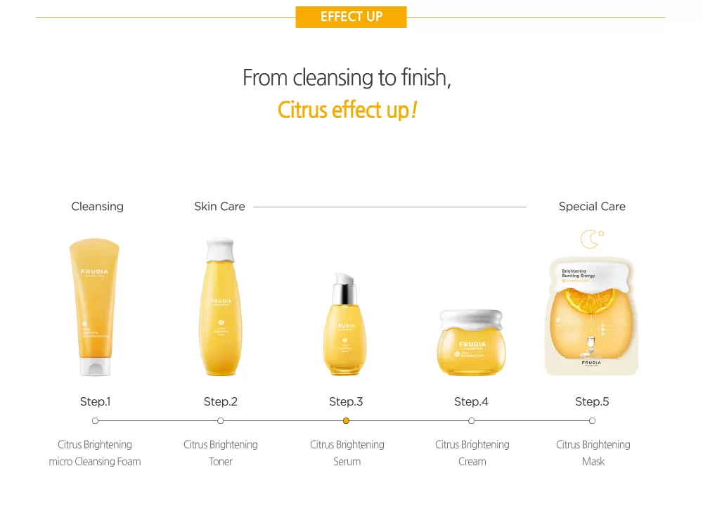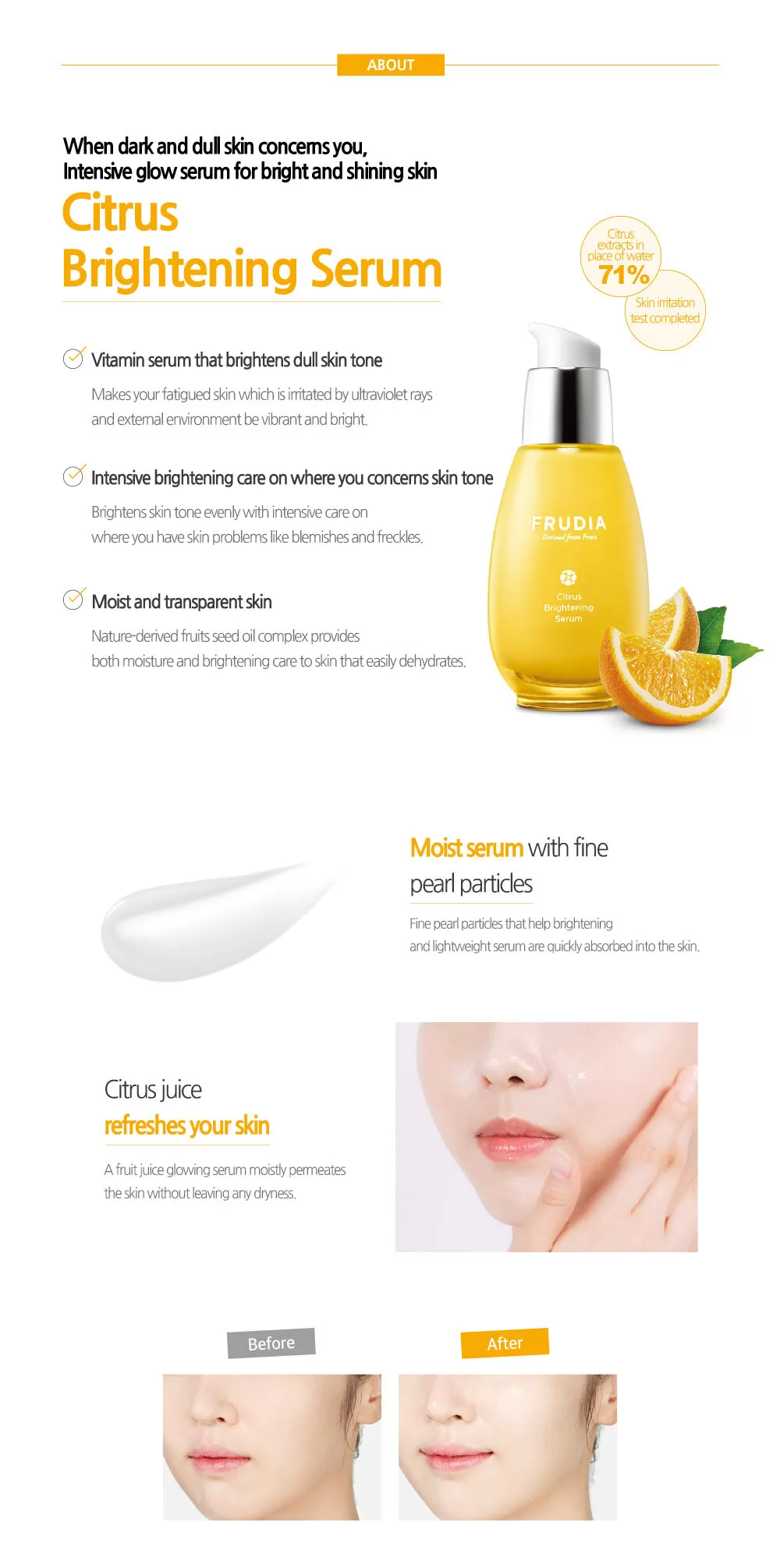 Frudia Citrus Brightening Serum inneholder 71% Jeju mandarinskallekstrakt som er rik på vitamin C istedenfor vann, sammen med Niacinamide vil denne serumet jevne ut hudtonen og motvirke fine linjer (well-aging). Mangofrøolje vil tilføre huden rikelig med fuktighet. Serumet er blank i fargen, har fullført hudirritasjonstest, og kan brukes på sensitiv hud. Kommer i flaske med pumpe og er lett å påføre huden.