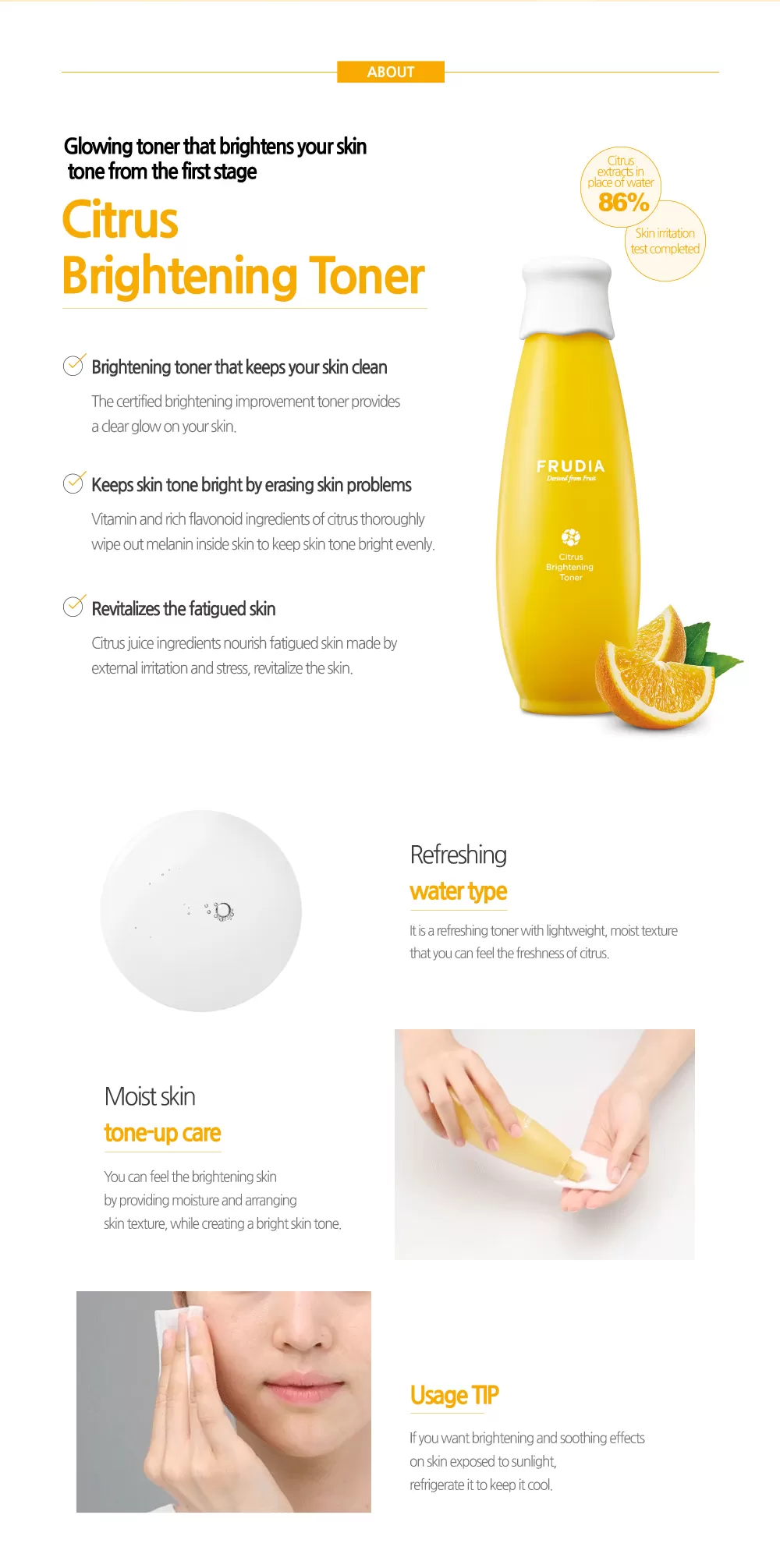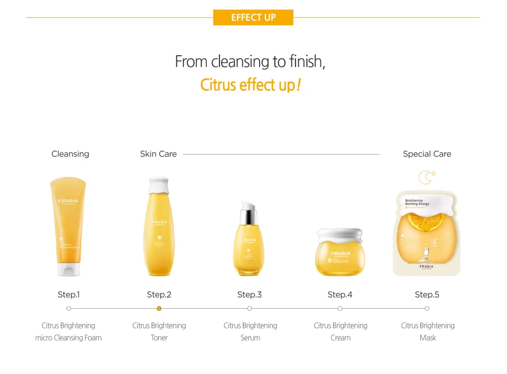 Frudia Citrus Brightening Toner er en vitaminrik toner som inneholder 86% Jeju mandarinskall ekstrakt istedenfor vann. Inneholder Niacinamide som vil jevne ut hudtonen og hjelpe mot hyperpigmentering, mens mangofrøolje vil gi huden en naturlig glød og tilføre den rikelig med fukt. Toneren har fullført hudirritasjonstest, og kan brukes på sensitiv hud.