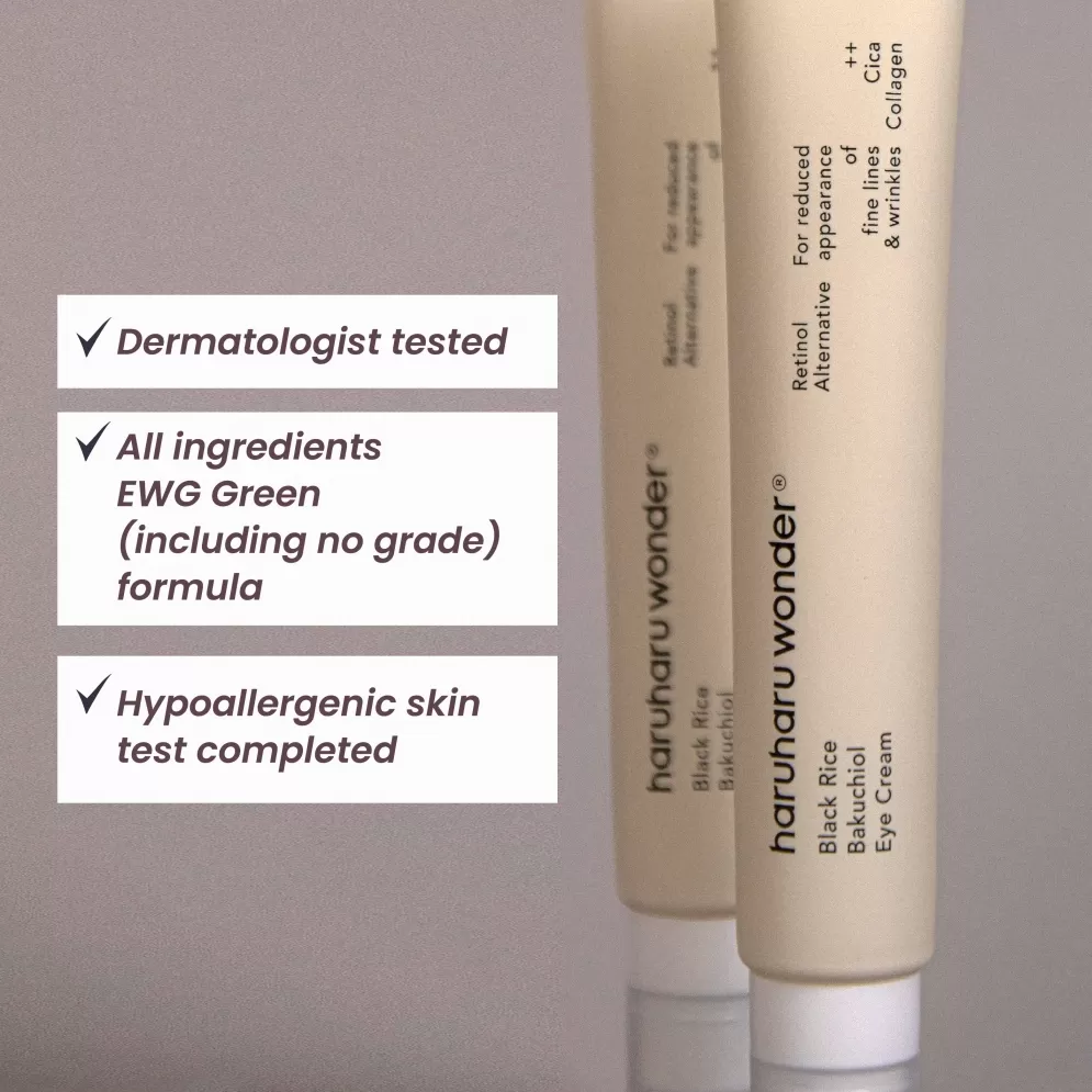 Haruharu Wonder Black Rice Bakuchiol Eye Cream er en lett øye krem laget med fermentert svart ris, bambusskuddbarkekstrakt og 5000ppm planteavledet Bakuchiol (100% plantebasert erstatning for Retinol) . Denne øyekremen er utviklet for å motvirke fine linjer (well-aging/rynker) og mørke ringer rundt øynene. Øyekremen er dermatologisk testet, inneholder kun EWG grønne ingredienser og er hypoallergenisk testet.