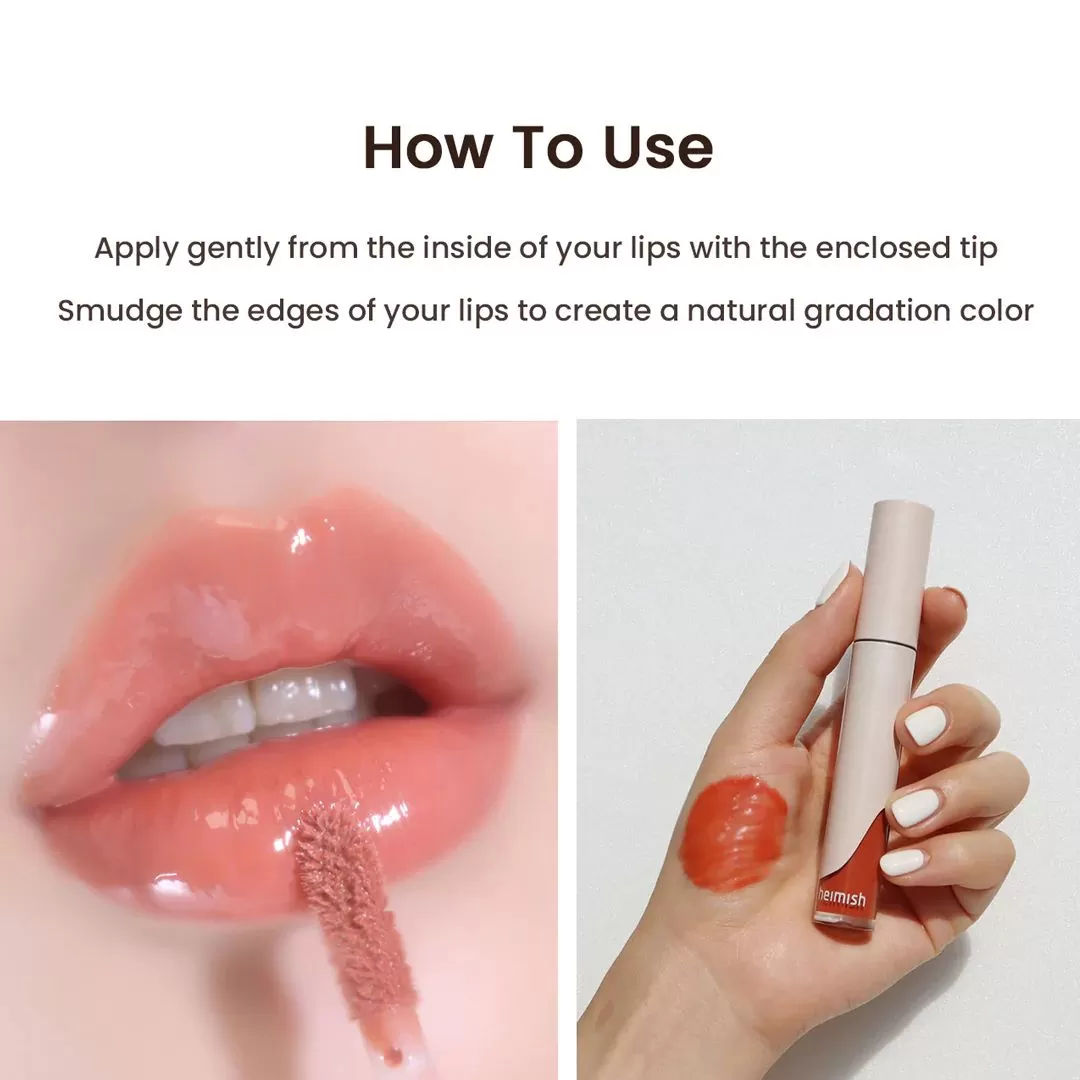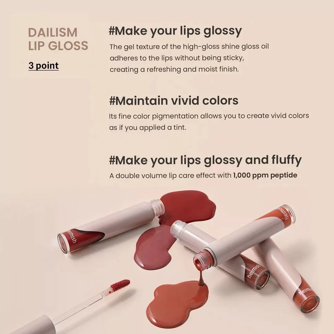 Heimish Dailism Lip Gloss er fylt med fukt og gir leppene en frisk og fargerik finish. Denne glossen har en gel-aktig tekstur uten å være klebrig, inneholder 1000ppm peptide som vil hjelpe leppene å holde på fuktigheten.