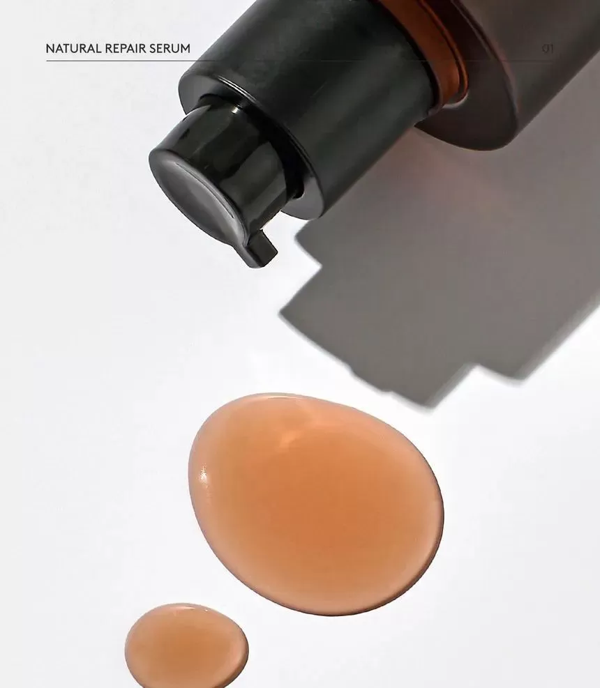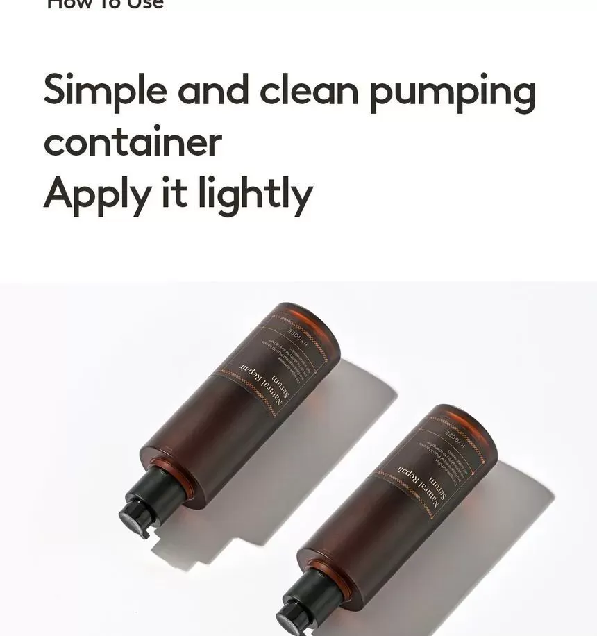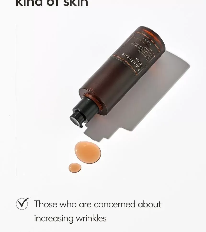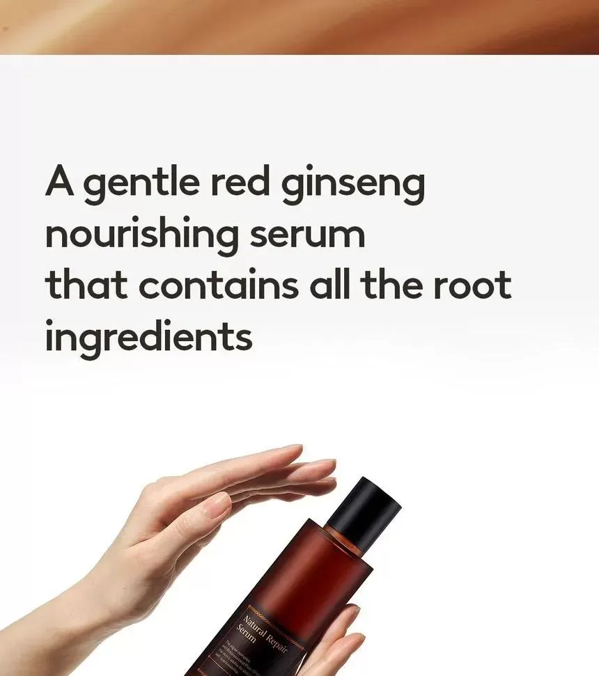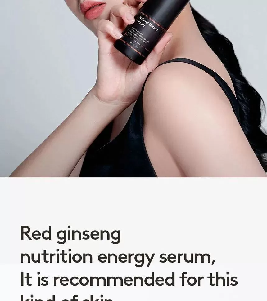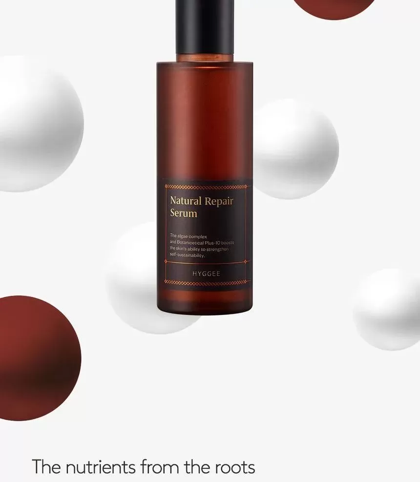 HYGGEE Natural Repair Serum er en mild, lysende serum som motvirker fine linjer (Well-aging). Den har en revitaliserende effekt og hjelper huden med langvarig fuktighet og glans uten å irritere. Serumen inneholder 66,7% ekstrakt fra rød ginseng som er rik på antioksidanter og gir effekten av fastere og sunnere hud. Inneholder i tillegg 10 forskjellige typer naturlige røtter som morbærbark, spansk lakrisrot og svart sesam, sammen er disse rik på antioksidanter og har en reparerende effekt på huden. Ekstrakt fra Ascophyllum nodosum (Rockweed, en type alger som vokser langs kystområder) eksfolierer huden skånsomt. Formelen har en lett tekstur som føles glatt på huden.