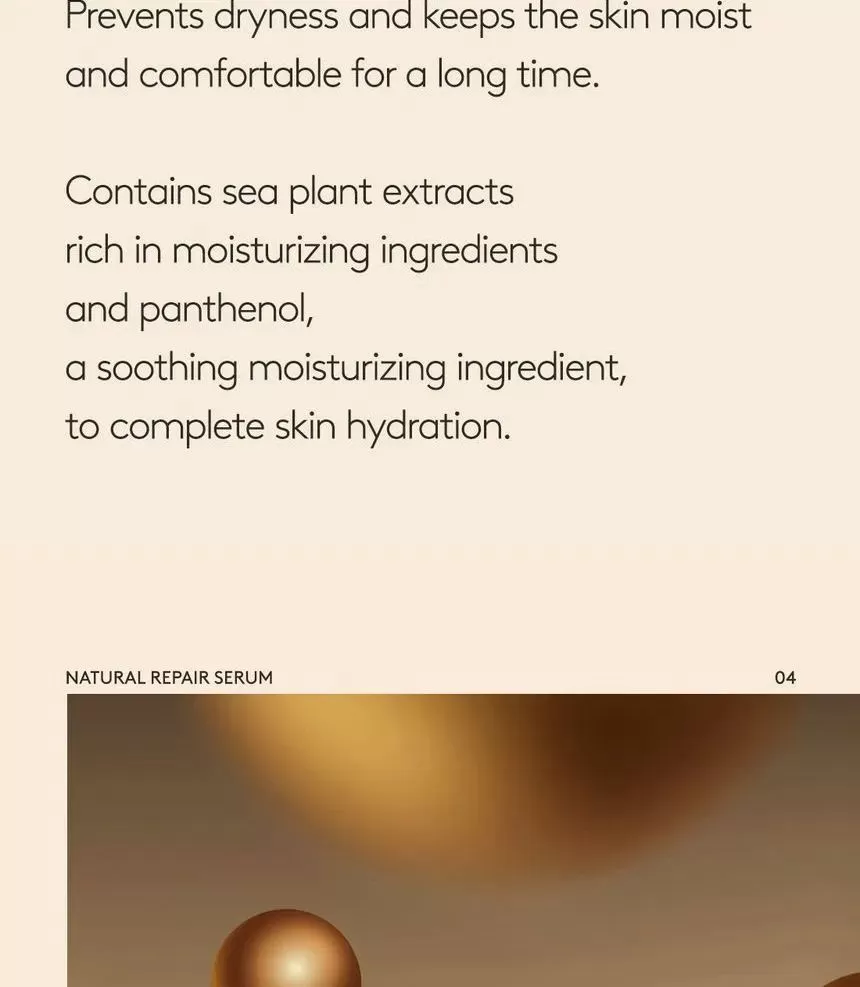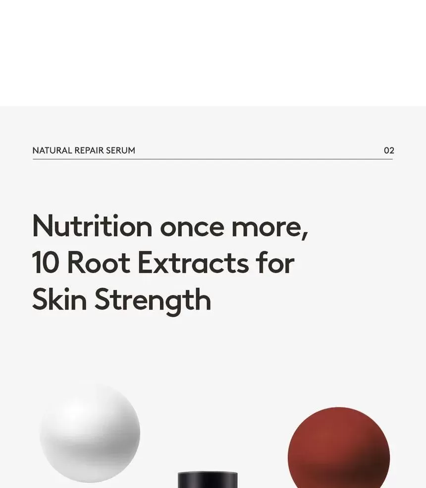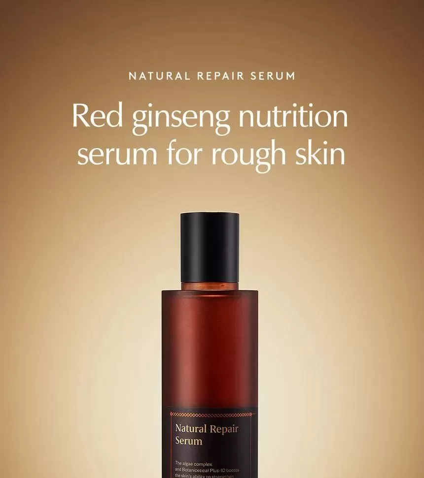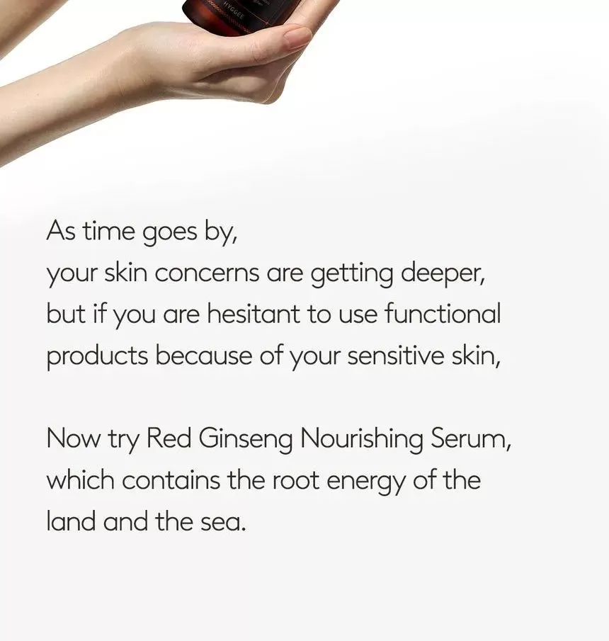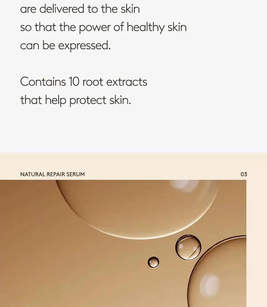 HYGGEE Natural Repair Serum er en mild, lysende serum som motvirker fine linjer (Well-aging). Den har en revitaliserende effekt og hjelper huden med langvarig fuktighet og glans uten å irritere. Serumen inneholder 66,7% ekstrakt fra rød ginseng som er rik på antioksidanter og gir effekten av fastere og sunnere hud. Inneholder i tillegg 10 forskjellige typer naturlige røtter som morbærbark, spansk lakrisrot og svart sesam, sammen er disse rik på antioksidanter og har en reparerende effekt på huden. Ekstrakt fra Ascophyllum nodosum (Rockweed, en type alger som vokser langs kystområder) eksfolierer huden skånsomt. Formelen har en lett tekstur som føles glatt på huden.