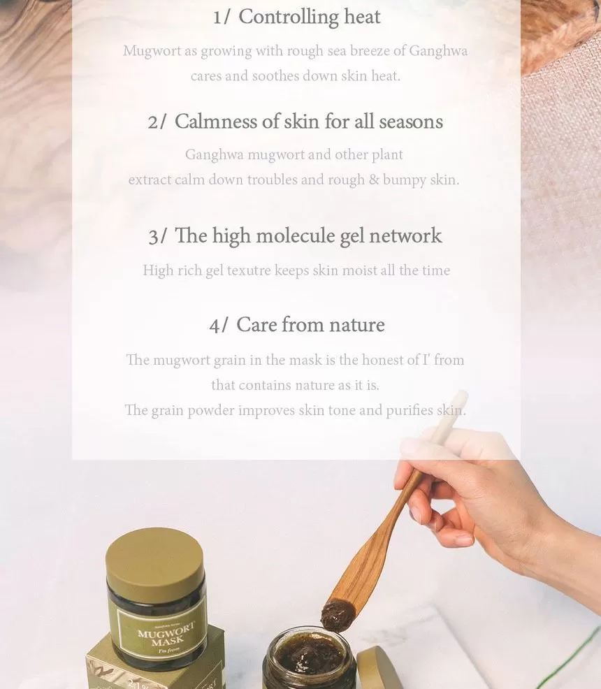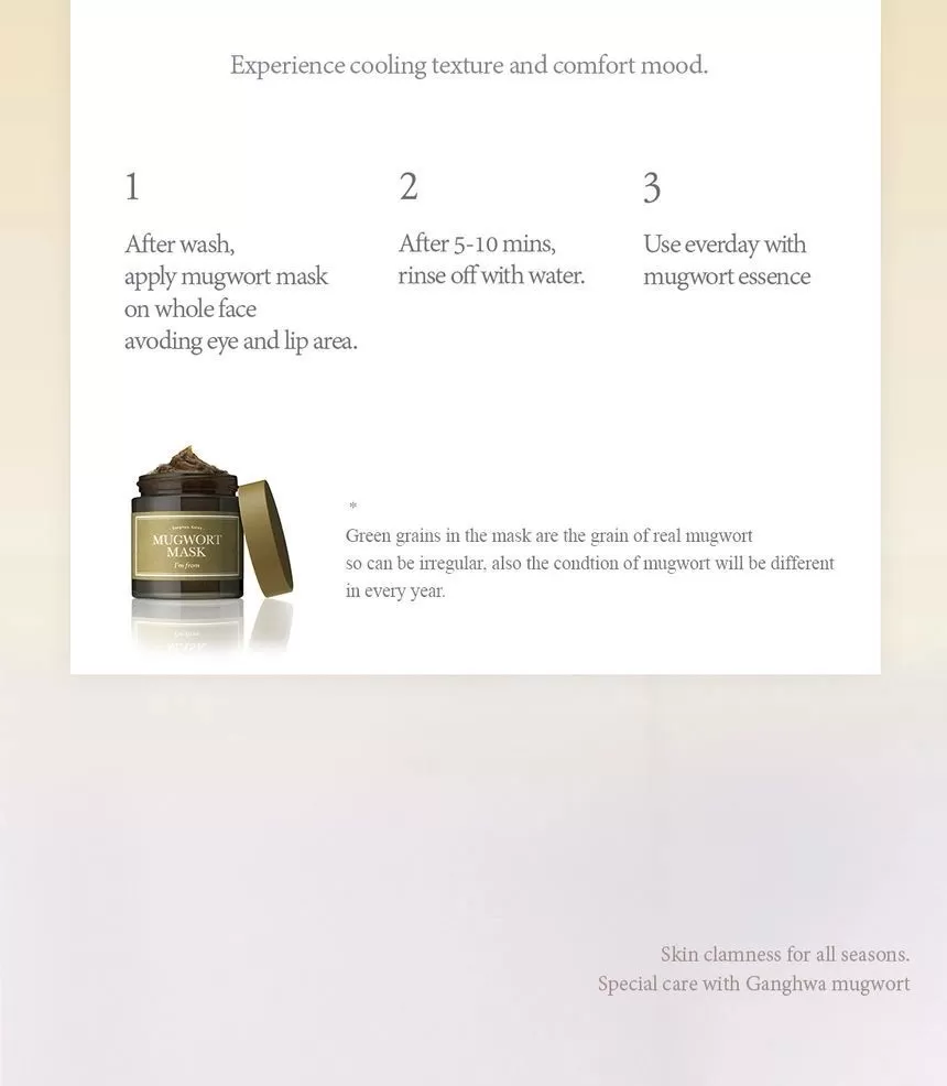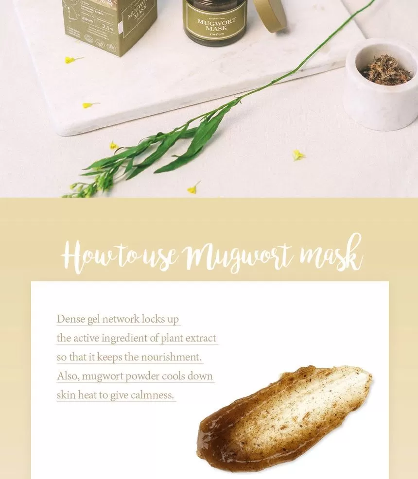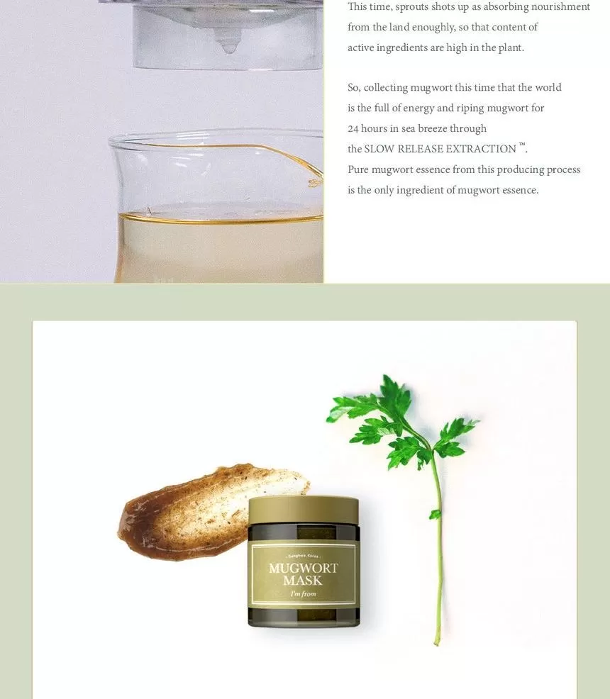 I’m From Mugwort Mask er en førsteklasses luksus spa-maske som inneholder 2,1 prosent naturlig burot (Mugwort) som vil lindre irritert, sensitiv hud og har en avkjølende effekt. Masken vil gi en jevnere hudtone, hydrere huden og berolige. Påføres fra 10 minutter til en time, skylles av med lunkent vann.