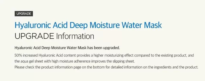 Isntree Hyaluronic Acid Deep Moisture Water Mask er en fuktighetsbombe av en ansiktsmaske (sheet-mask) som inneholder 3 ulike typer hyaluronsyre. Masken vil også hjelpe å til å styrke hudbarrieren slik at huden holder seg fuktig. Masken er laget av en "gel" materiale som er helt naturlig og er helt irritasjonsfri.