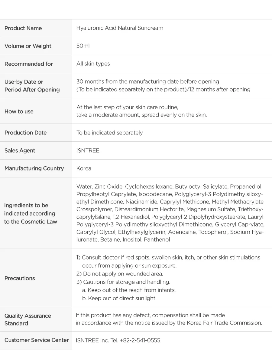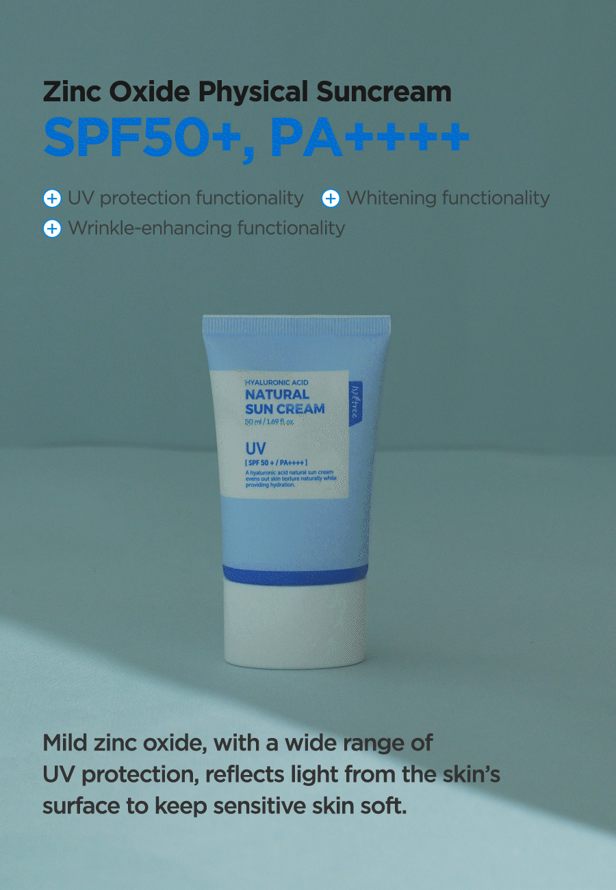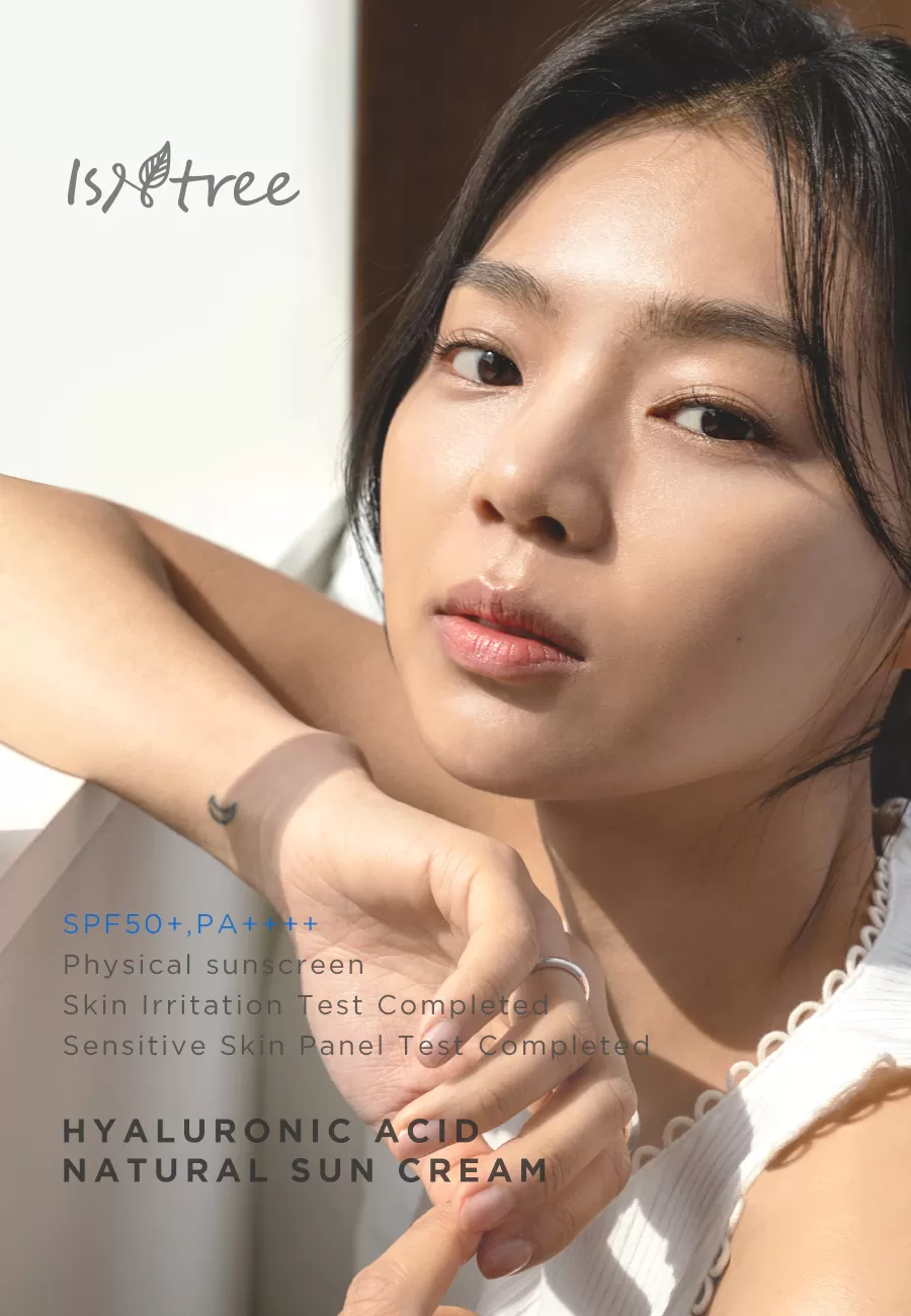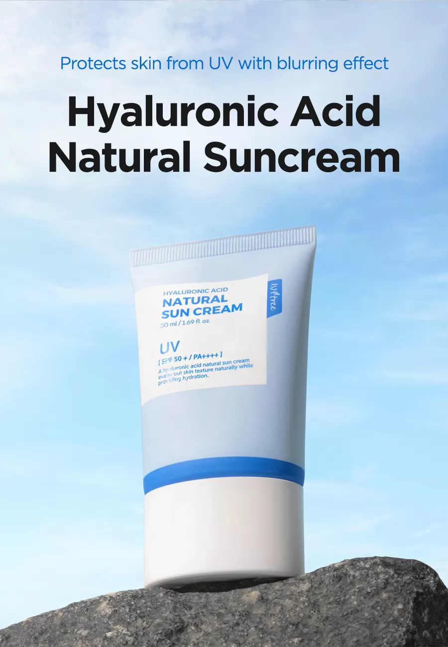 Isntree Hyaluronic Acid Natural Sun Cream er en bredspekter SPF 50+ solkrem som beskytter mot UVA og UVB stråling, denne naturlige solkremen har er lett å påføre uten å etterlate den kjente hvite hinnen som man ofte får fra solkremer. Denne solkremen inneholder i tillegg Hyaluronsyrer som motvirker fuktighetstap og hjelper å binde fuktigheten i huden, Inositol (Vitamin B8) som er et kjent antioksidant som motvirker frie radikaler og Panthenol som motvirker uttørking av huden, denne solkremen er skånsom slik at den også kan brukes av de med sensitiv hud.