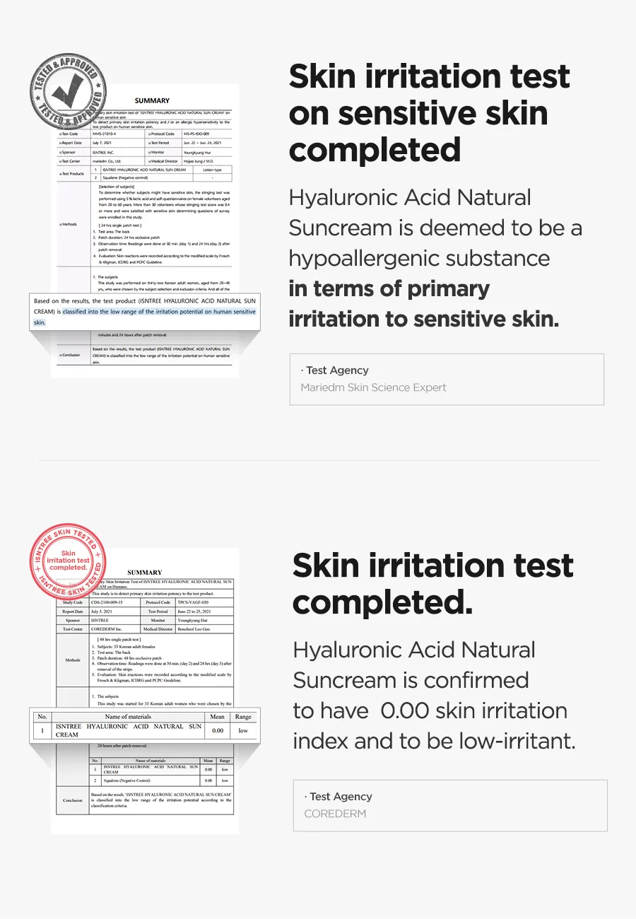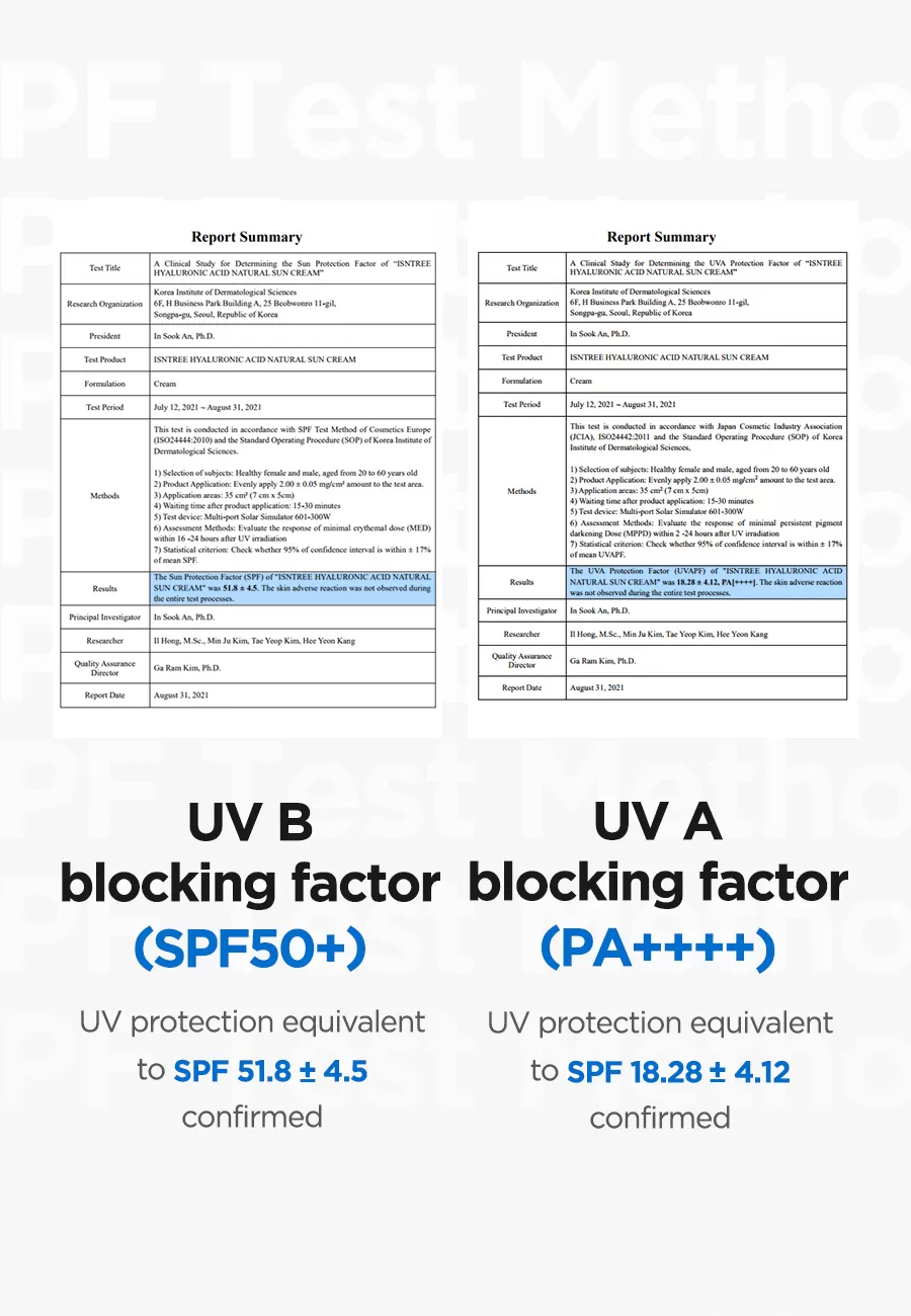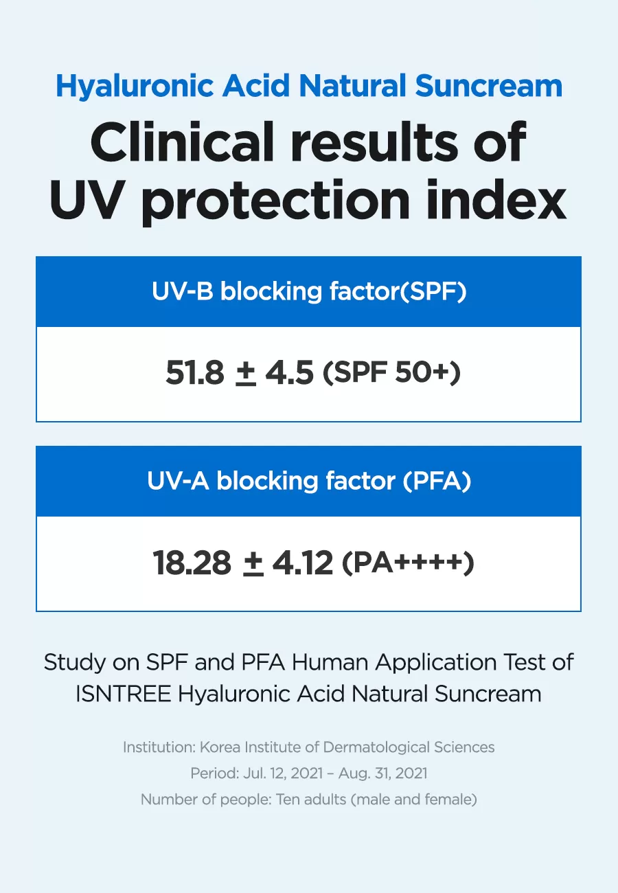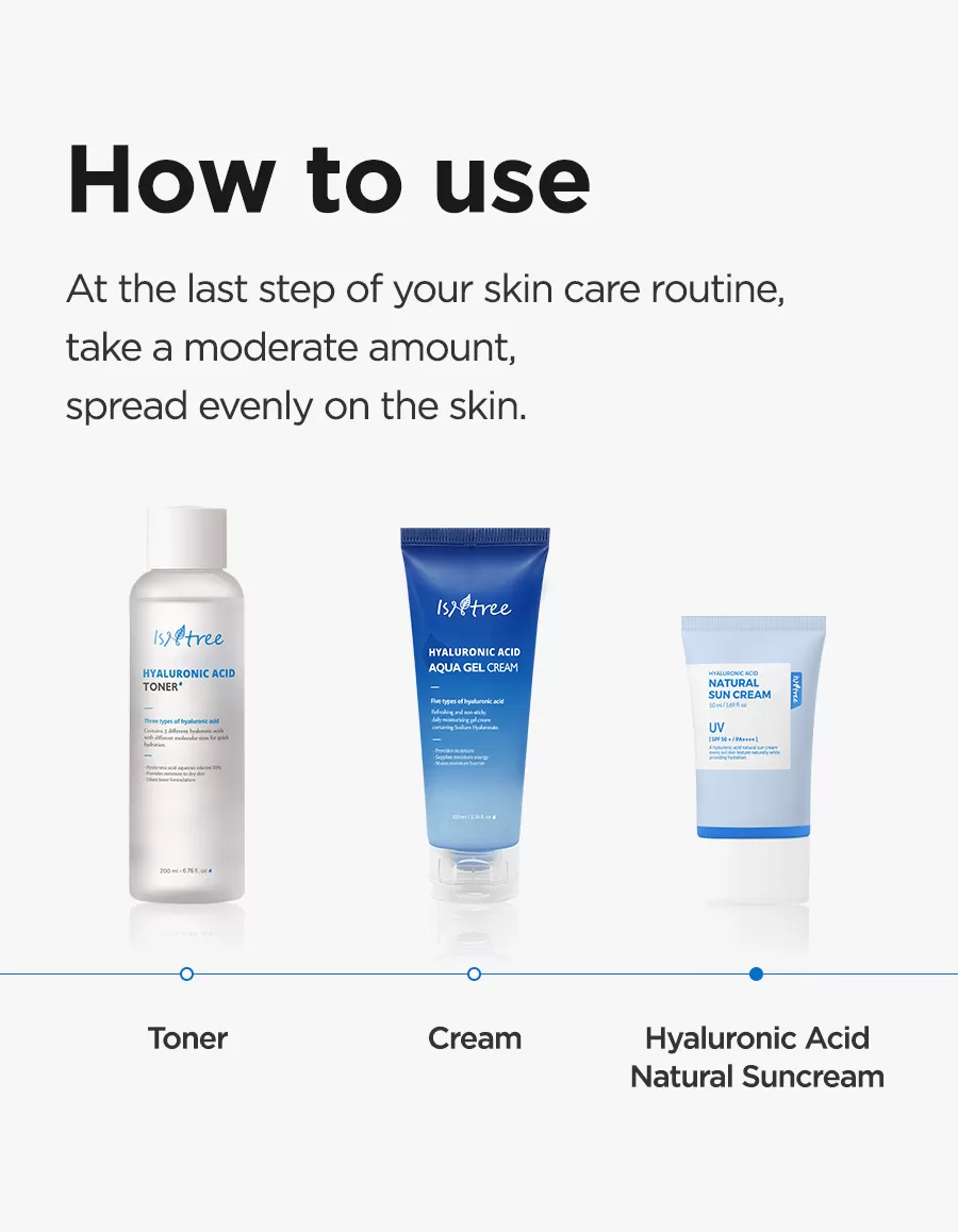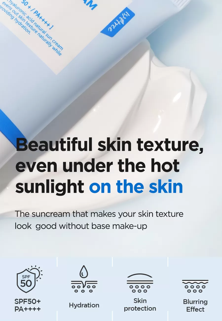 Isntree Hyaluronic Acid Natural Sun Cream er en bredspekter SPF 50+ solkrem som beskytter mot UVA og UVB stråling, denne naturlige solkremen har er lett å påføre uten å etterlate den kjente hvite hinnen som man ofte får fra solkremer. Denne solkremen inneholder i tillegg Hyaluronsyrer som motvirker fuktighetstap og hjelper å binde fuktigheten i huden, Inositol (Vitamin B8) som er et kjent antioksidant som motvirker frie radikaler og Panthenol som motvirker uttørking av huden, denne solkremen er skånsom slik at den også kan brukes av de med sensitiv hud.