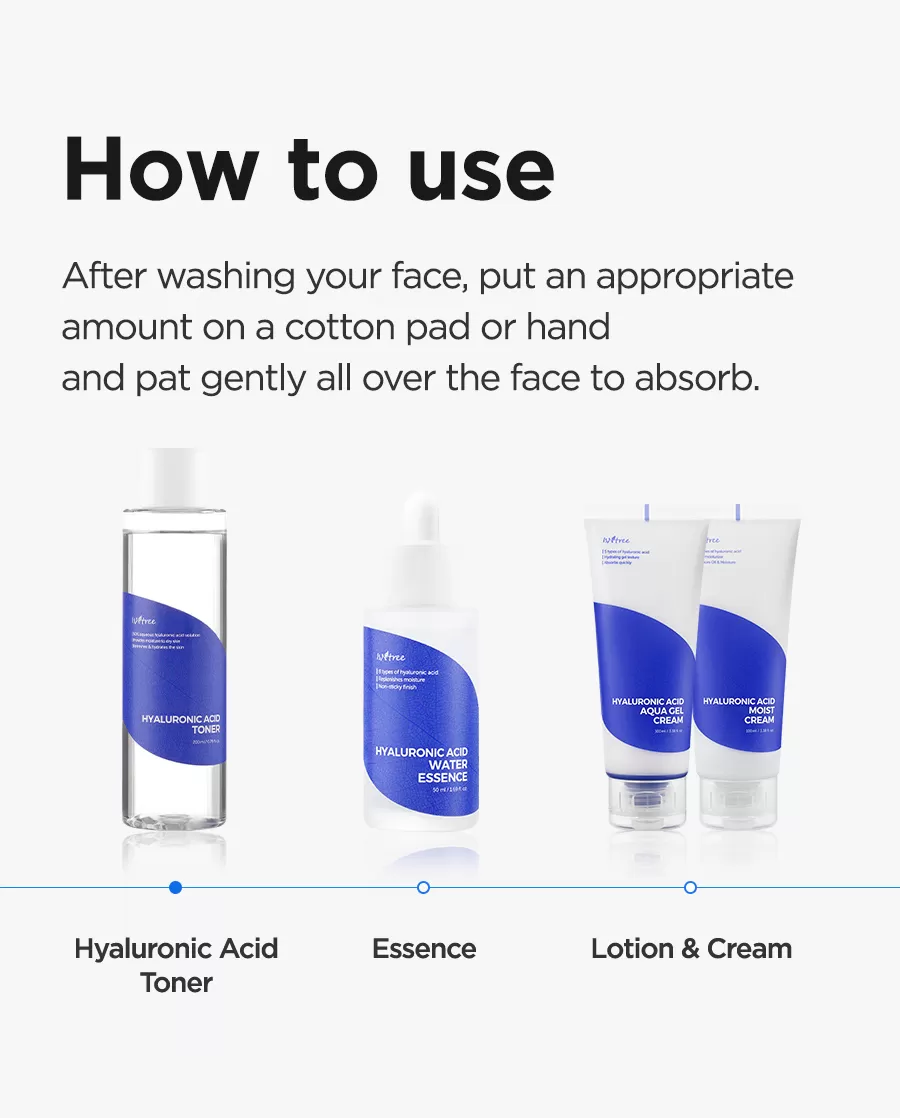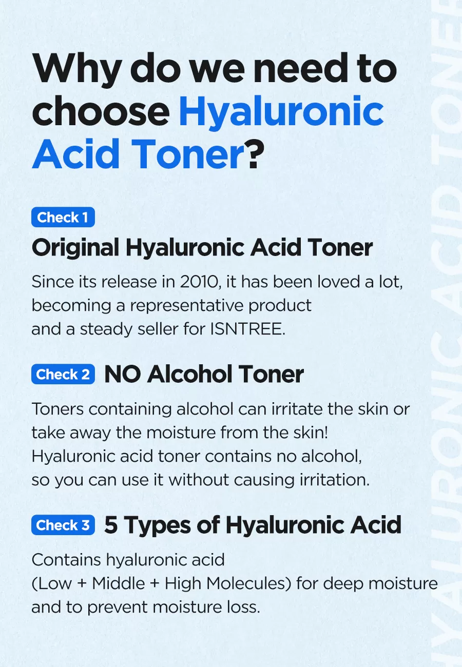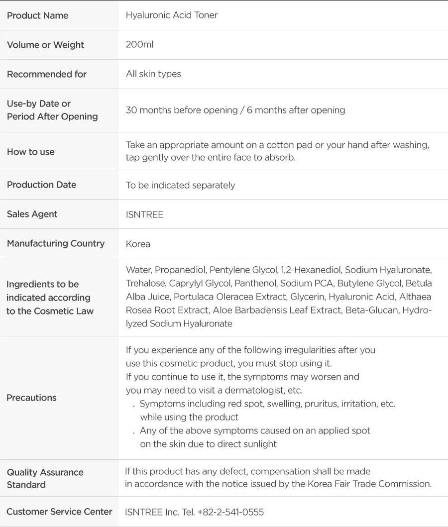 Isntree Hyaluronic Acid Toner er en toner utviklet for å tilføre huden masse fukt, en prisvinnende toner som anbefales sterkt til de med dehydrert hud. Inneholder hele 50% hyaluronsyre (3 typer) som har ulike molekylstørrelser for en mest mulig optimal formulering som vil gir en optimal absorpsjon, fra ytre hudlag ned i dybden. Denne toneren vil også beskytte huden mot fuktighetstap. NMF (Natural Moisture Factors) ingredienser som Sodium PCA, Beta-Glucan og Panthenol hjelper huden å holde på fuktighet og næring over tid.