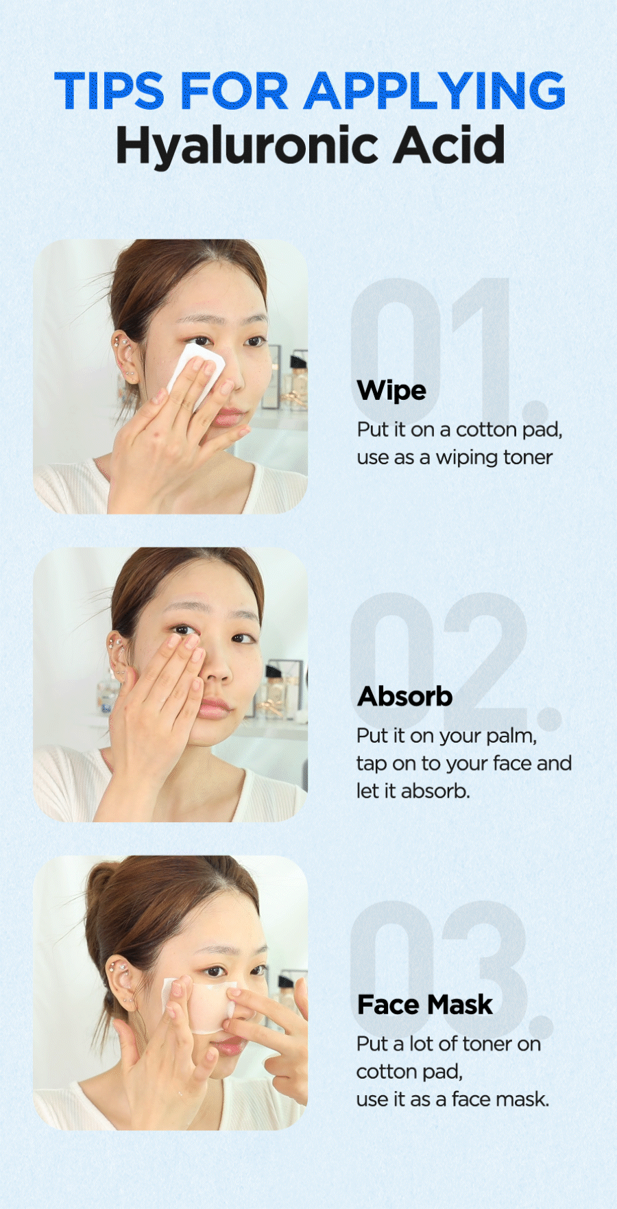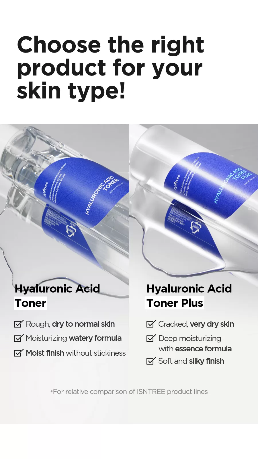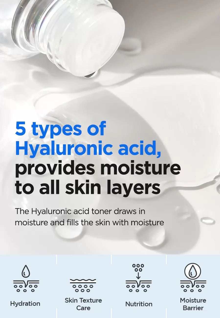 Isntree Hyaluronic Acid Toner er en toner utviklet for å tilføre huden masse fukt, en prisvinnende toner som anbefales sterkt til de med dehydrert hud. Inneholder hele 50% hyaluronsyre (3 typer) som har ulike molekylstørrelser for en mest mulig optimal formulering som vil gir en optimal absorpsjon, fra ytre hudlag ned i dybden. Denne toneren vil også beskytte huden mot fuktighetstap. NMF (Natural Moisture Factors) ingredienser som Sodium PCA, Beta-Glucan og Panthenol hjelper huden å holde på fuktighet og næring over tid.