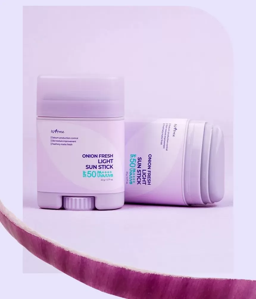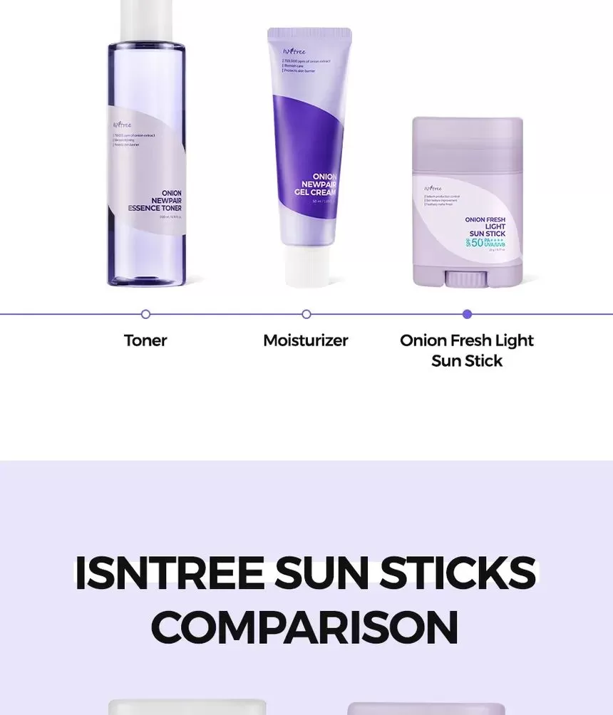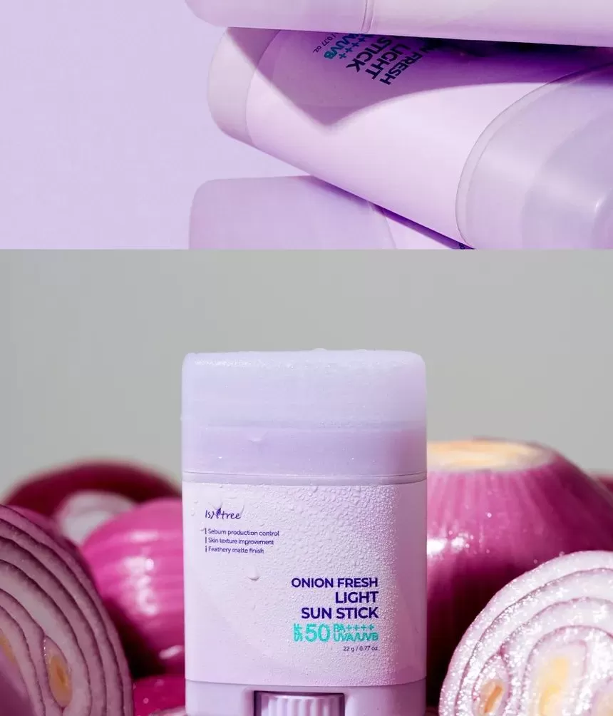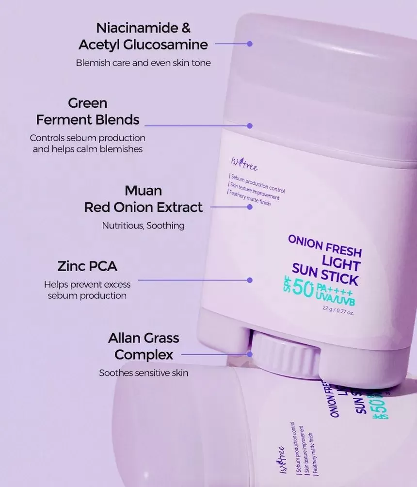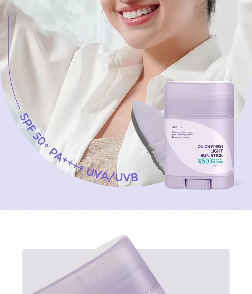 Isntree Onion Fresh Light Sun Stick er en bredspekter SPF50 PA++++ solstift. Inneholder muan rødløkekstrakt for å redusere og fjerne urenheter samtidig som den beroliger huden. Denne solkremen inneholder også ingredienser som Zinc PGA og GFG (Green Ferment Blends) som sammen vil reguldere overflødig talgproduksjon og minimerer forekomsten av forstørrede porer. Niacinamide og Acetylglukosamin jobber sammen for å forbedre hudtekstur og lindrer irritasjon. Stifen har en lett tekstur som etterlater huden med en fløyelsmyk finish uten fete rester.