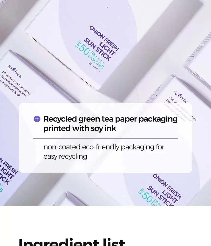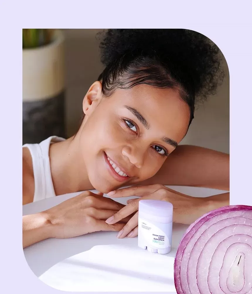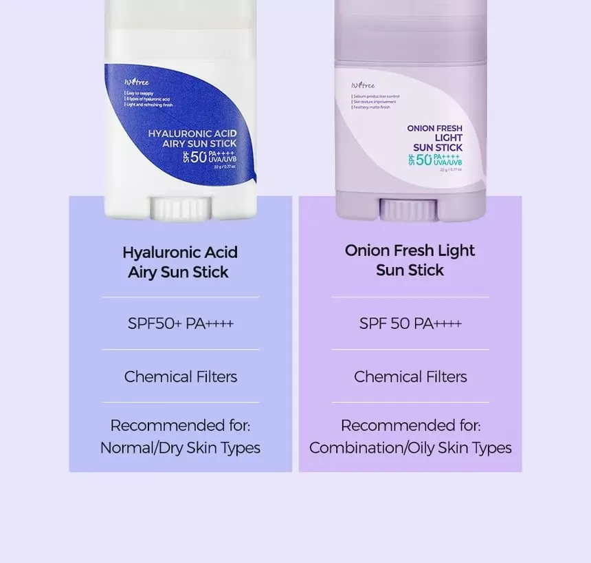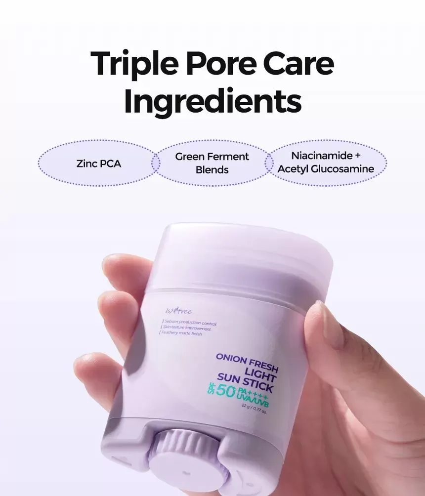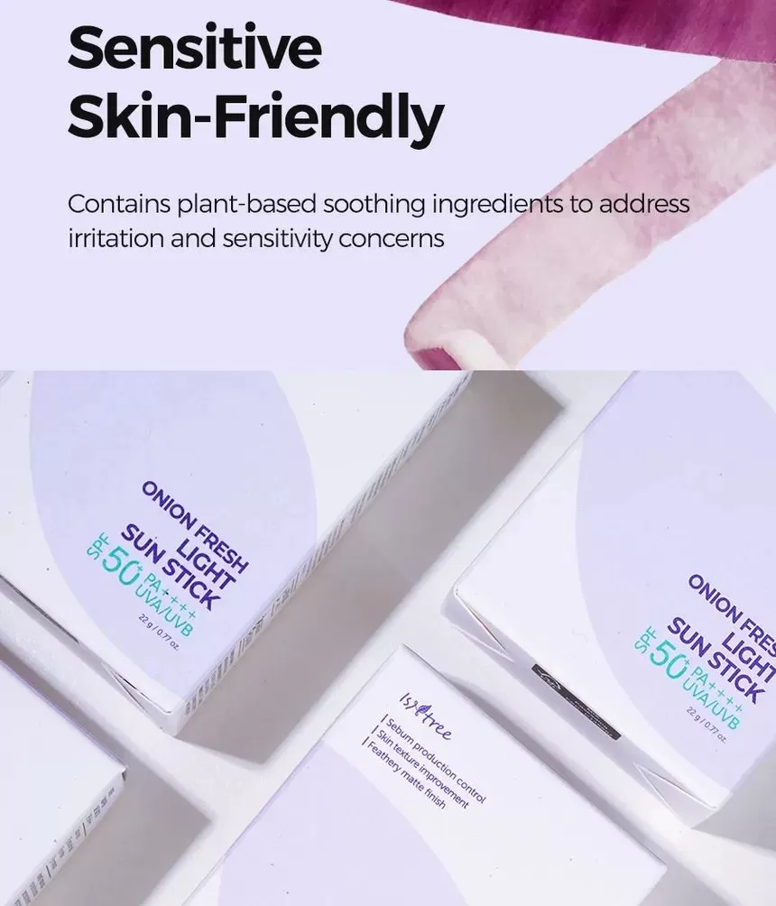 Isntree Onion Fresh Light Sun Stick er en bredspekter SPF50 PA++++ solstift. Inneholder muan rødløkekstrakt for å redusere og fjerne urenheter samtidig som den beroliger huden. Denne solkremen inneholder også ingredienser som Zinc PGA og GFG (Green Ferment Blends) som sammen vil reguldere overflødig talgproduksjon og minimerer forekomsten av forstørrede porer. Niacinamide og Acetylglukosamin jobber sammen for å forbedre hudtekstur og lindrer irritasjon. Stifen har en lett tekstur som etterlater huden med en fløyelsmyk finish uten fete rester.