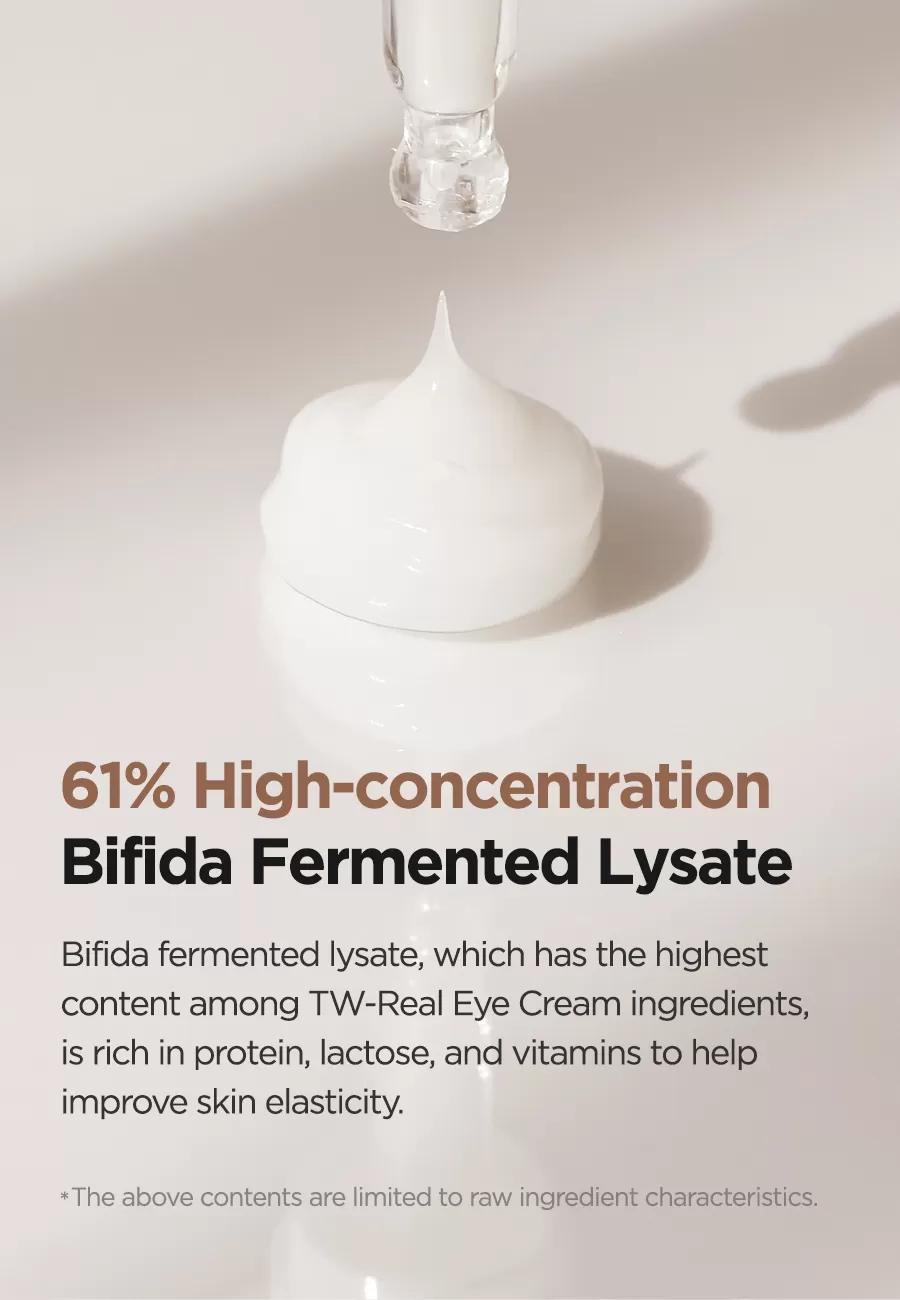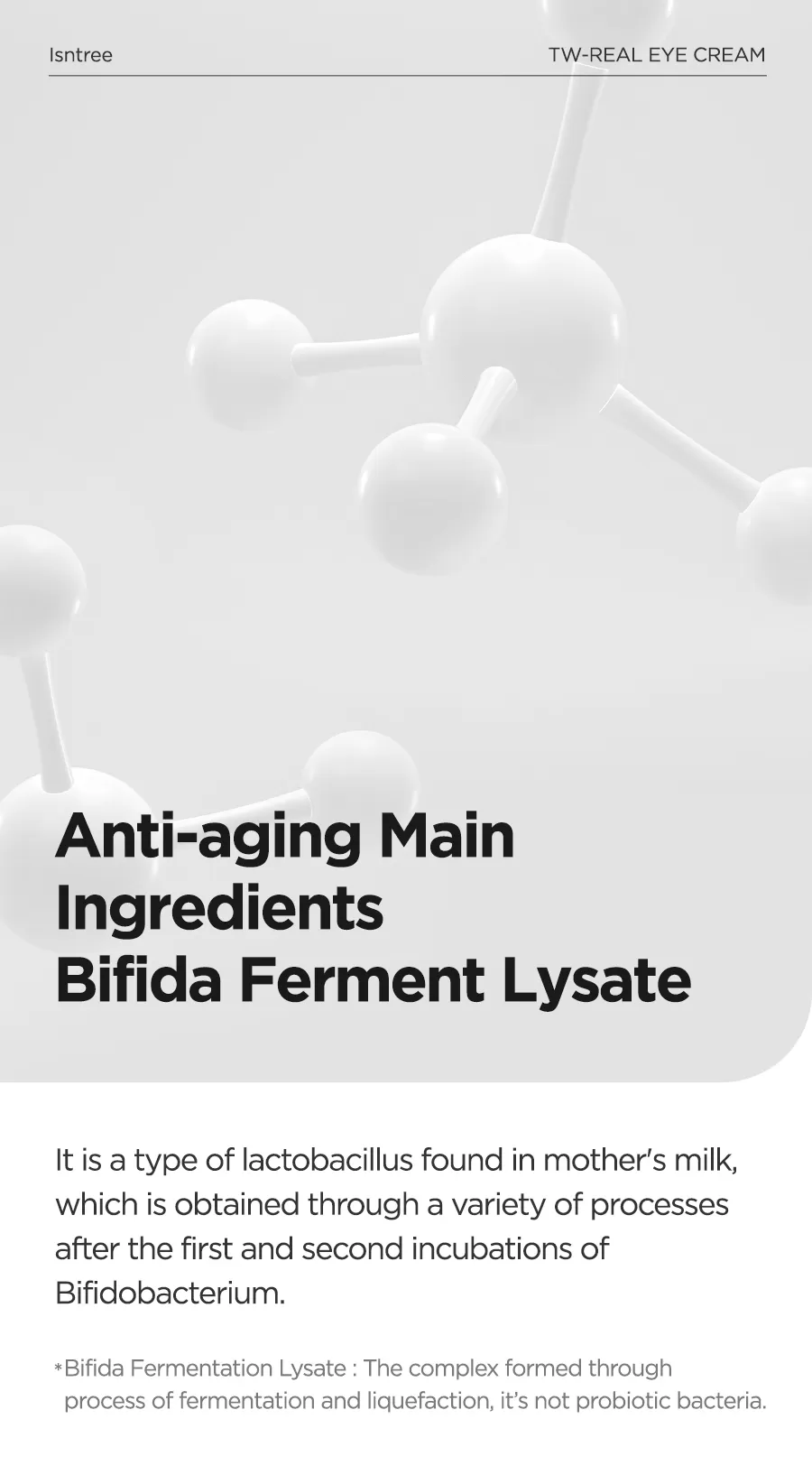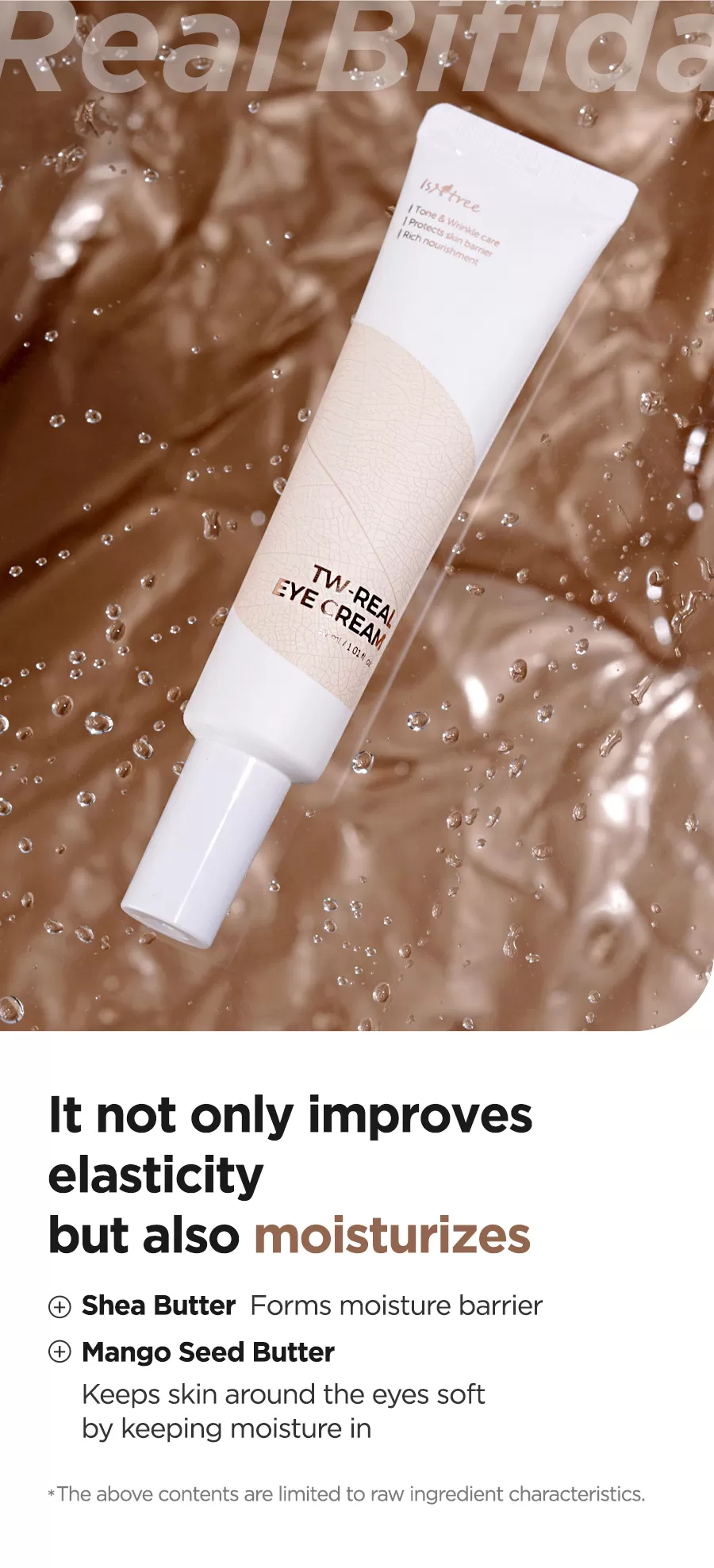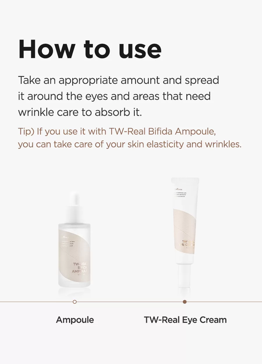 Isntree TW-Real Eye Cream inneholder 61% bifda som gjør dette til en næringsgivende og pleiende øyekrem som hjelper huden å bygge opp hudbarrieren. Inneholder Vitamin-E som vil beskytte huden mot solskader og frie radikaler. Niacinamide og Adenosine vil gi huden spenst og motvirke fine linjer, samtidig vil øyekremen motvirke mørke ringer rundt øynene. Er formulert slik at denne også kan brukes av de med sensitiv hudtype. Fri for parfyme, parabener, silikon og essensielle oljer.