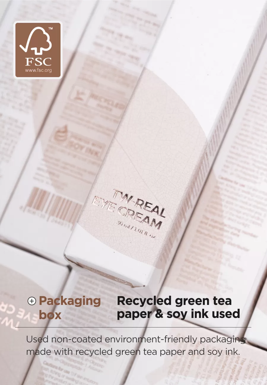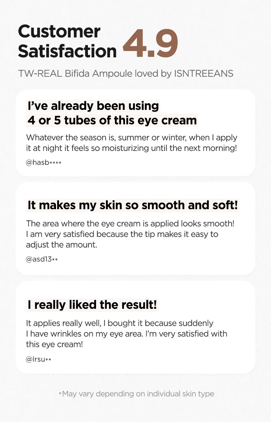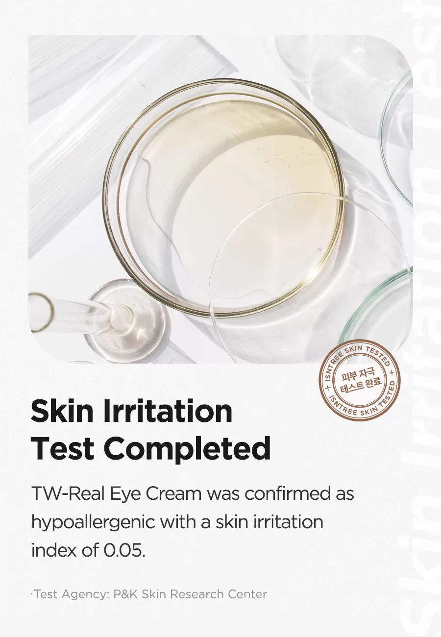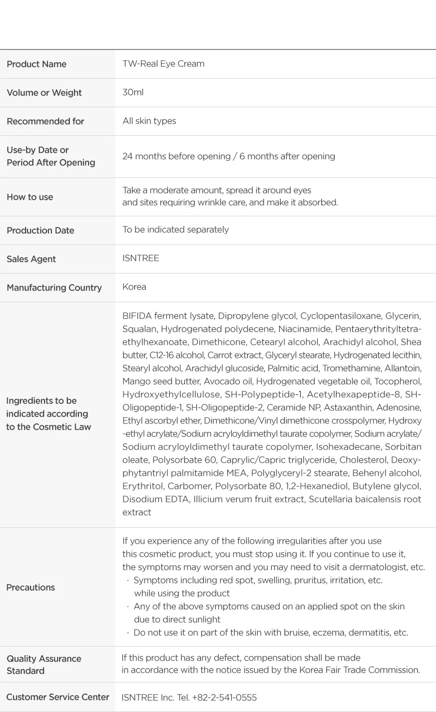 Isntree TW-Real Eye Cream inneholder 61% bifda som gjør dette til en næringsgivende og pleiende øyekrem som hjelper huden å bygge opp hudbarrieren. Inneholder Vitamin-E som vil beskytte huden mot solskader og frie radikaler. Niacinamide og Adenosine vil gi huden spenst og motvirke fine linjer, samtidig vil øyekremen motvirke mørke ringer rundt øynene. Er formulert slik at denne også kan brukes av de med sensitiv hudtype. Fri for parfyme, parabener, silikon og essensielle oljer.