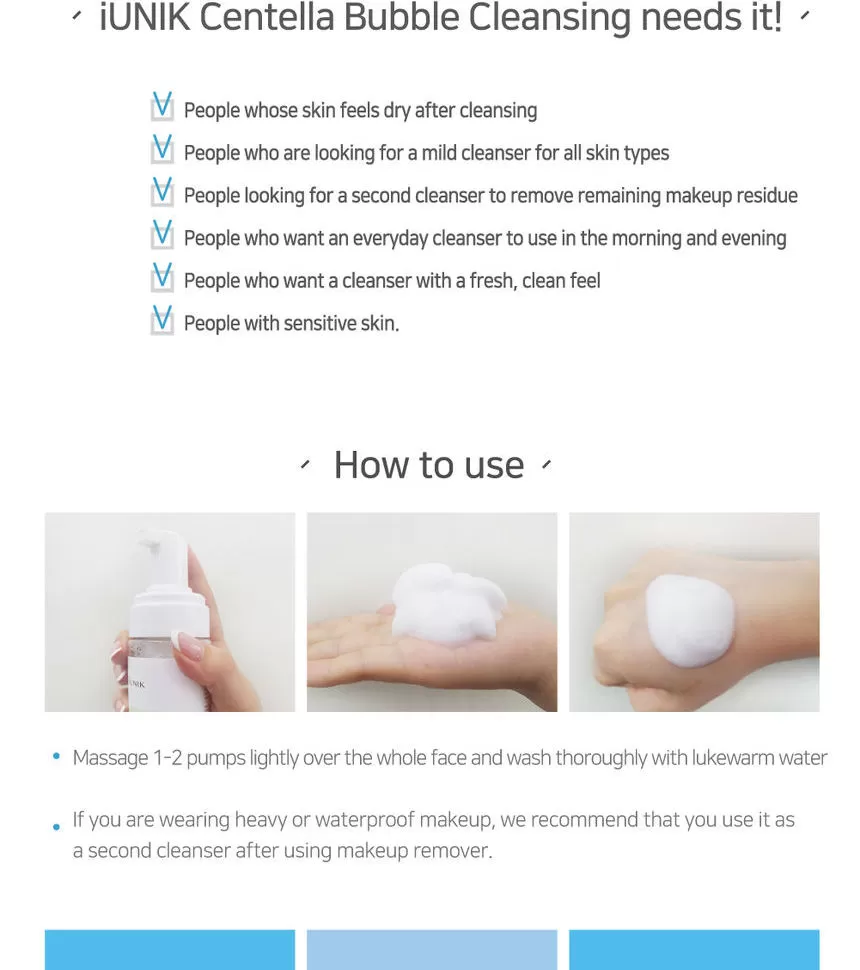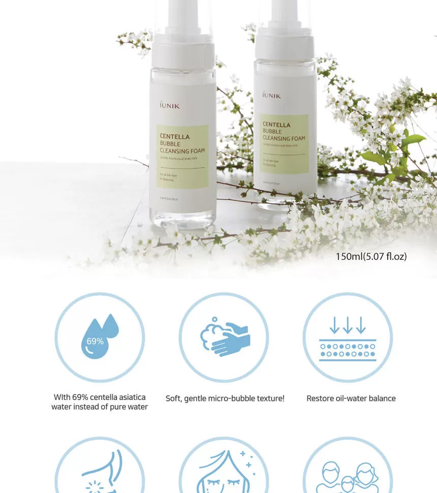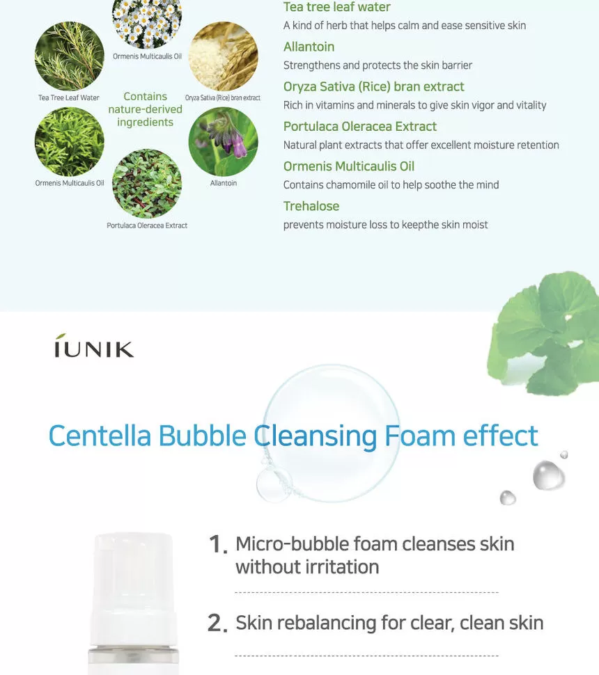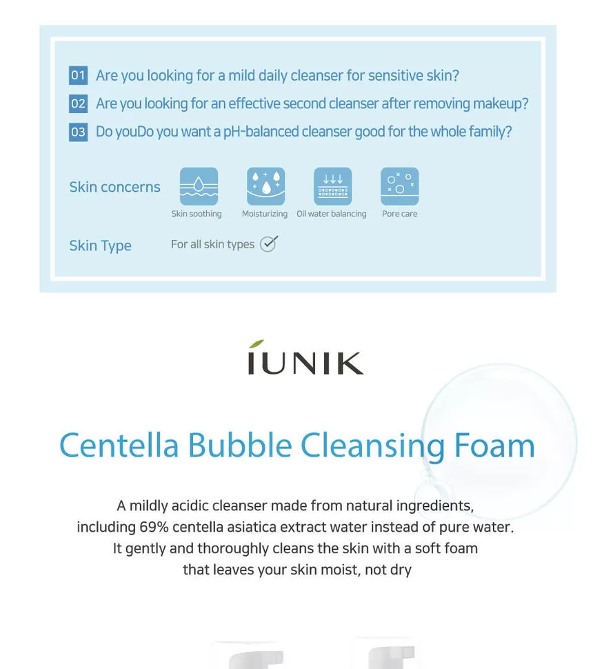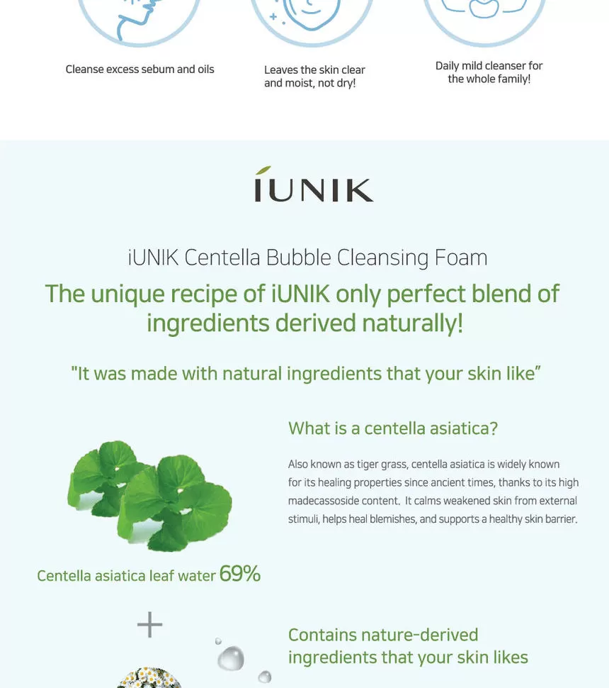 iUNIK Centella Bubble Cleansing Foam er en mild, lav pH-rens formulert med 69 % Centella Asiatica-ekstraktvann, som gir en skånsom og beroligende rens for hudens overflate. Den skaper et mykt, kremaktig skum som fjerner smuss og overflødig talg — samtidig som botaniske fuktgivere etterlater huden hydrert og komfortabel.