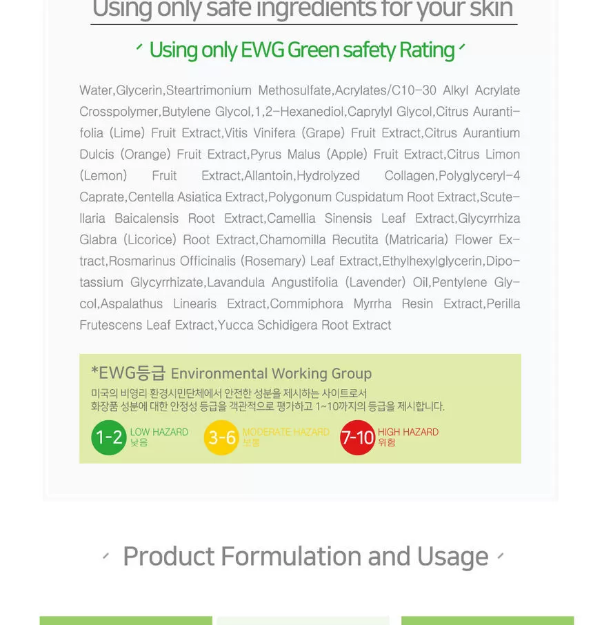 | Ingredienser | Water, Glycerin, Steartrimonium Methosulfate, Acrylates/C10-30 Alkyl Acrylate Crosspolymer, Butylene Glycol, 1,2-Hexanediol, Citrus Aurantifolia (Lime) Fruit Extract, Vitis Vinifera (Grape) Fruit Extract, Citrus Aurantium Dulcis (Orange) Fruit Extract, Pyrus Malus (Apple) Fruit Extract, Citrus Limon (Lemon) Fruit Extract, Caprylyl Glycol, Allantoin, Hydrolyzed Collagen, Polyglyceryl-4 Caprate, Centella Asiatica Extract, Polygonum Cuspidatum Root Extract, Scutellaria Baicalensis Root Extract, Camellia Sinensis Leaf Extract, Glycyrrhiza Glabra (Licorice) Root Extract, Chamomilla Recutita (Matricaria) Flower Extract, Rosmarinus Officinalis (Rosemary) Leaf Extract, Ethylhexylglycerin, Dipotassium Glycyrrhizate, Lavandula Angustifolia (Lavender) Oil, Pentylene Glycol, Aspalathus Linearis Extract. |