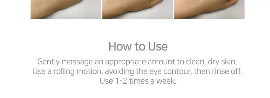 Etter rens, påfør en passende mengde på tørr hud. Masser forsiktig i sirkulære bevegelser i 30–60 sekunder til døde hudceller løsner. Skyll grundig med lunkent vann. Bruk 1–2 ganger i uken.