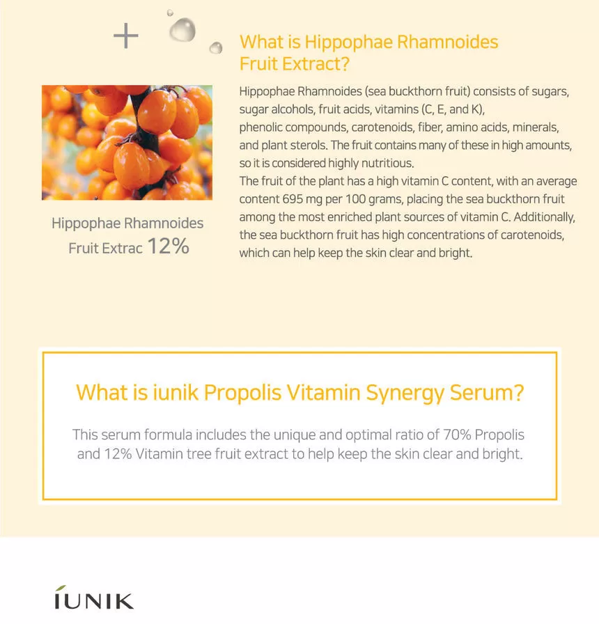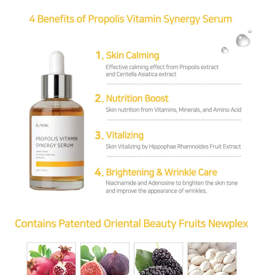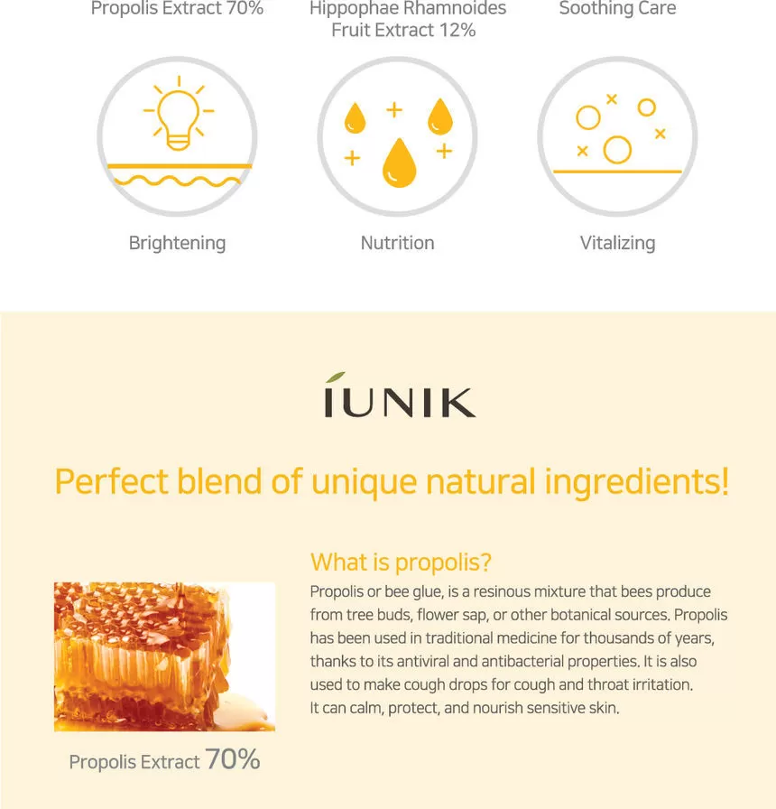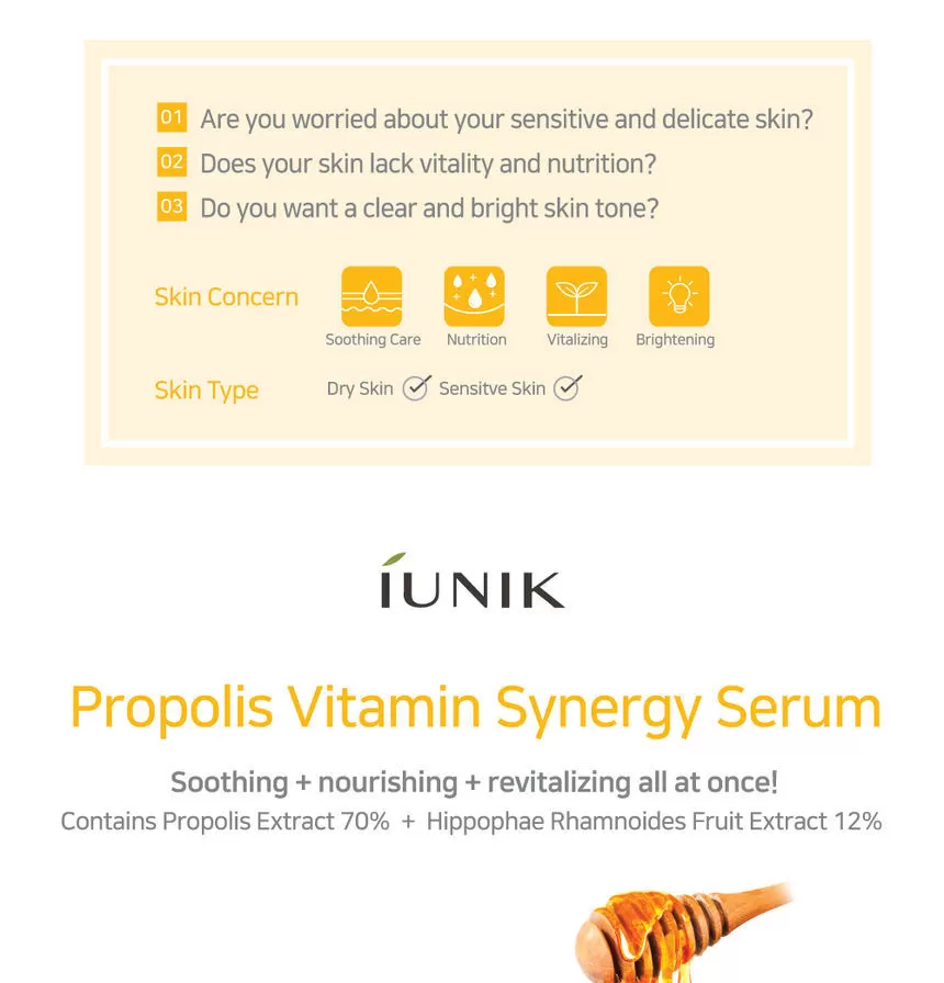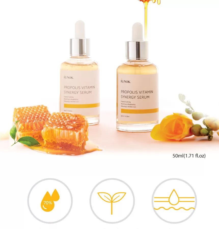 iUNIK Propolis Vitamin Synergy Serum er et nærende og beroligende serum som kombinerer høyt innhold av propolis-ekstrakt med vitamin-rike planteekstrakter for å gi huden styrke, glød og komfort. Formelen passer spesielt for hud som opplever irritasjon, tretthet, ujevn tone eller misfarging.