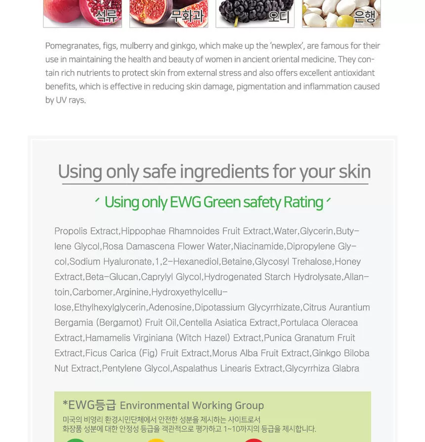 Propolisekstrakt, Hippophae Rhamnoides (havtorn) fruktekstrakt, vann, butylenglykol, glyserin, metylpropanediol, niacinamid, dipropylenglykol, 1,2-heksandiol, Rosa Damascena (rose) blomstervann, natriumhyaluronat, betain, glyconeyxtrakt, , Betaglukan, Hydrogenert stivelseshydrolysat, Allantoin, Karbomer, Arginin, Hydroksyetylcellulose, Adenosin, Kaliumglycyrrhizat, Pentylenglykol, Sitrus Aurantium Bergamia (Bergamot) Fruktolje, Centella Asiatica (Gotu Kola) Ekstrakt, Portulaca Hamamelis Virginiana (Witch Hazel) Extract, Punica Granatum (Pomegranate) Extract, Ficus Carica (Fig) Fruit Extract, Morus Alba (White Mulberry) Fruit Extract, Ginkgo Biloba (Maidenhair Tree) Nut extract, Caprylyl Glycol