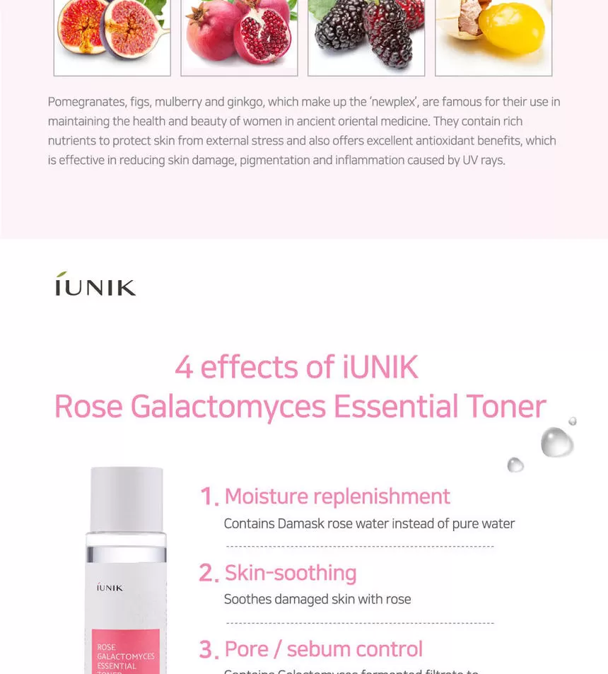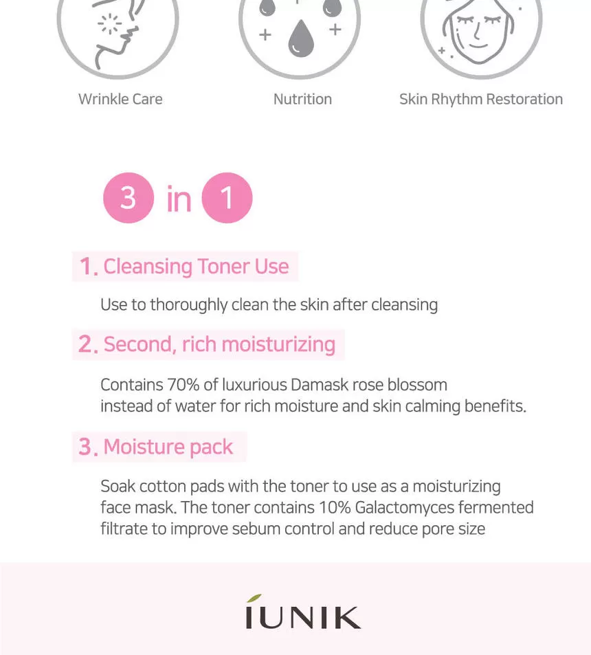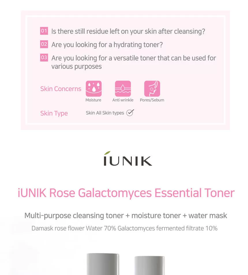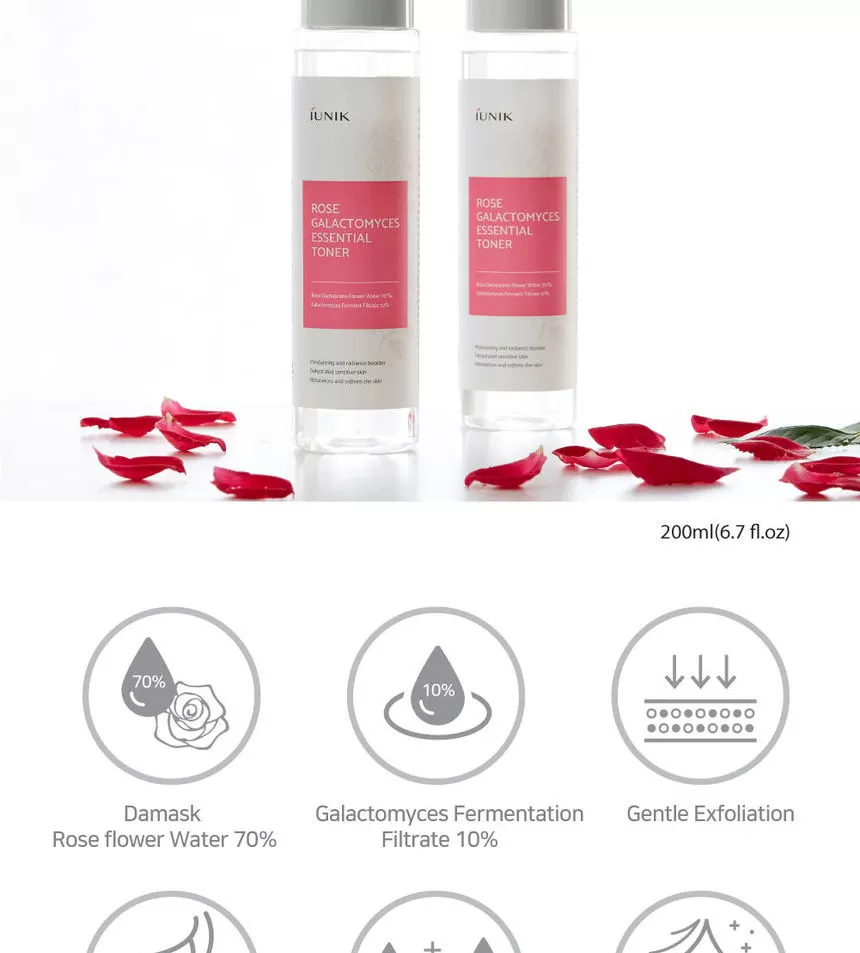 iUNIK Rose Galactomyces Essential Toner er en mild og pleiende toner med hele 70 % roseblomstvann og 10 % galactomyces-ferment filtrat – utviklet for å jevne hudtonen, tilføre fukt og styrke hudens barriere, samtidig som den passer spesielt godt for sensitiv hud. Den lette væskekonsistensen absorberes raskt og gir huden en myk og frisk overflate.