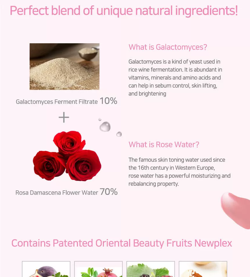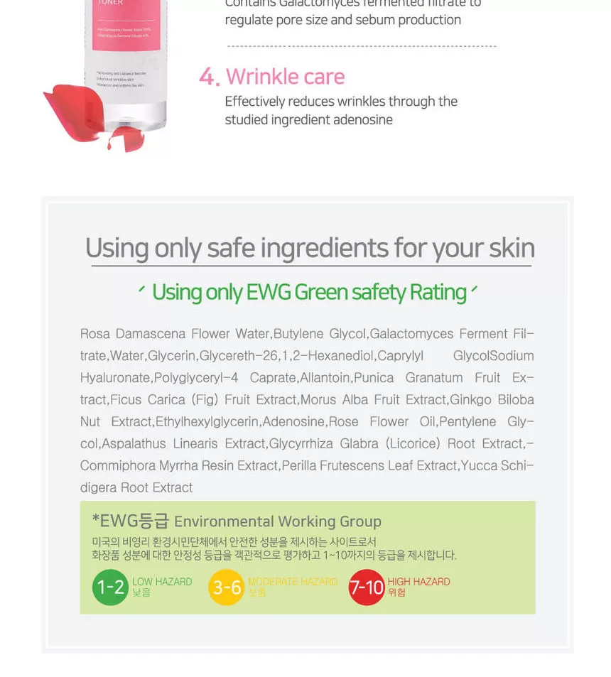 | Ingredienser | Rosa Damascena Flower Water (70 %), Galactomyces Ferment Filtrate (10 %), Butylene Glycol, Water, Glycerin, Glycereth-26, 1,2-Hexanediol, Sodium Hyaluronate, Caprylyl Glycol, Allantoin, Punica Granatum (Pomegranate) Fruit Extract, Ficus Carica (Fig) Fruit Extract, Morus Alba (Mulberry) Fruit Extract, Ginkgo Biloba Nut Extract, Adenosine, Ethylhexylglycerin, Rose Flower Oil, Pentylene Glycol, Aspalathus Linearis (Rooibos) Extract, Glycyrrhiza Glabra (Licorice) Root Extract, Commiphora Myrrha Resin Extract, Perilla Frutescens Leaf Extract, Yucca Schidigera Root Extract, … |